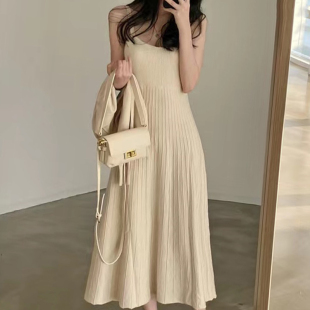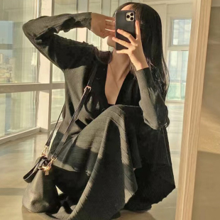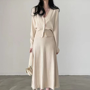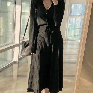 韩国chic秋冬复古V领单排扣长袖 U领收腰显瘦吊带连衣裙 针织开衫
