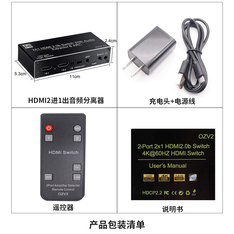 皮乐仕HDMI2.0切换器二进一出4K60hz音频分离器笔记本电脑PS4电视3.5光纤同轴转换器ARC音频HDMI2进1出分配器