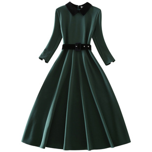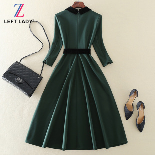 显瘦绿色七分袖 中长款 大摆连衣裙 气质优雅高端女装 清仓秋冬新款