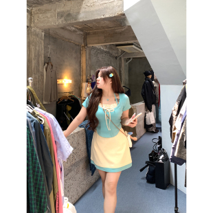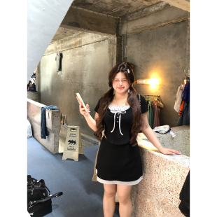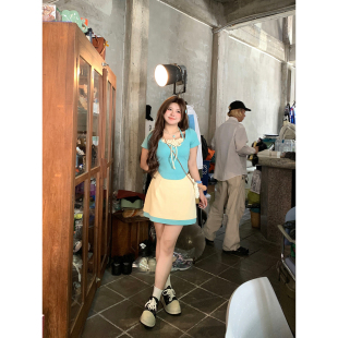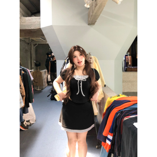 微胖大码 女夏新款 两件套 全垒打少女撞色T恤半裙针织套装 安妮不火
