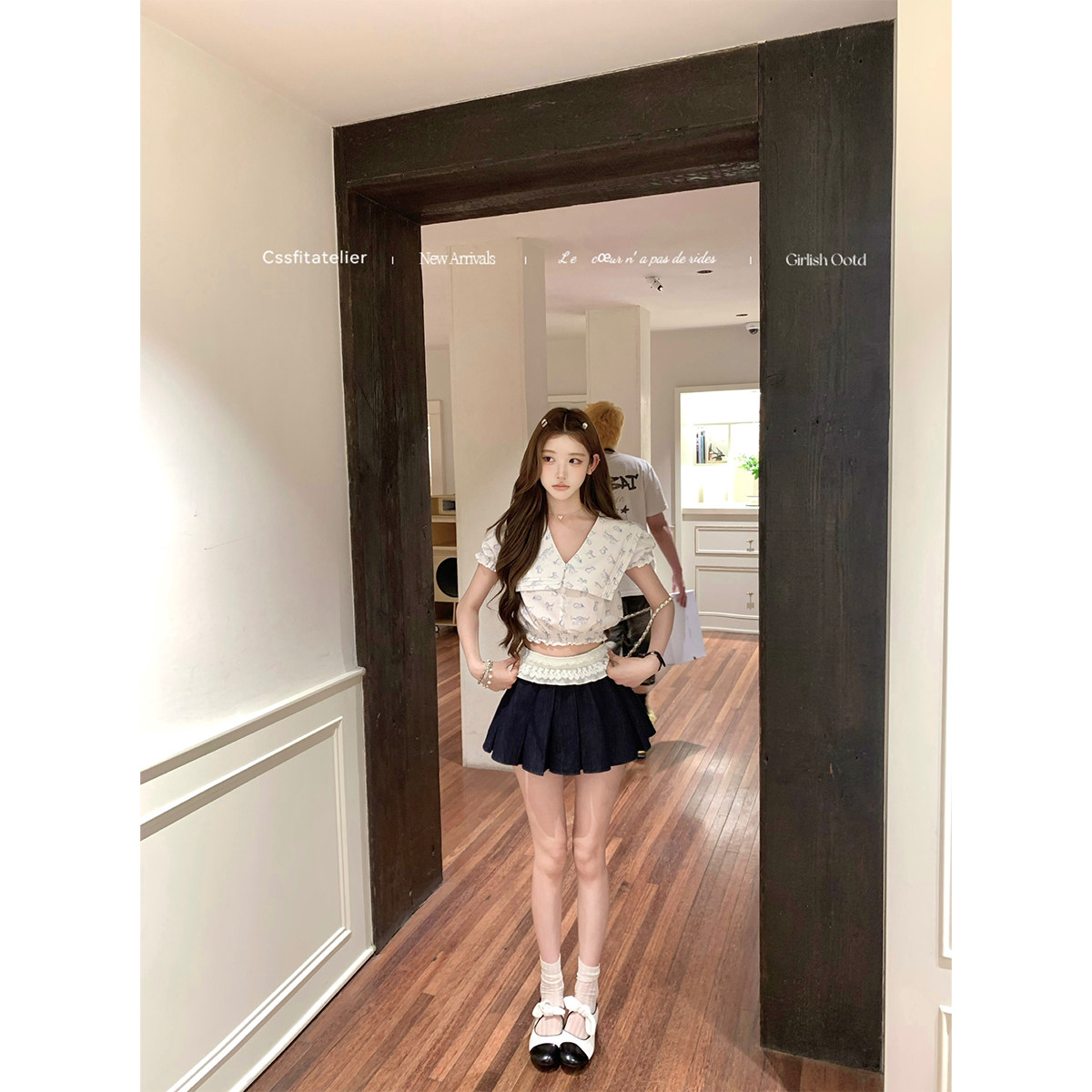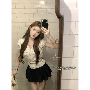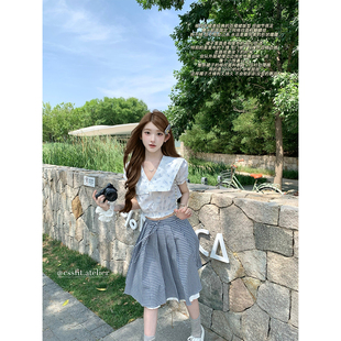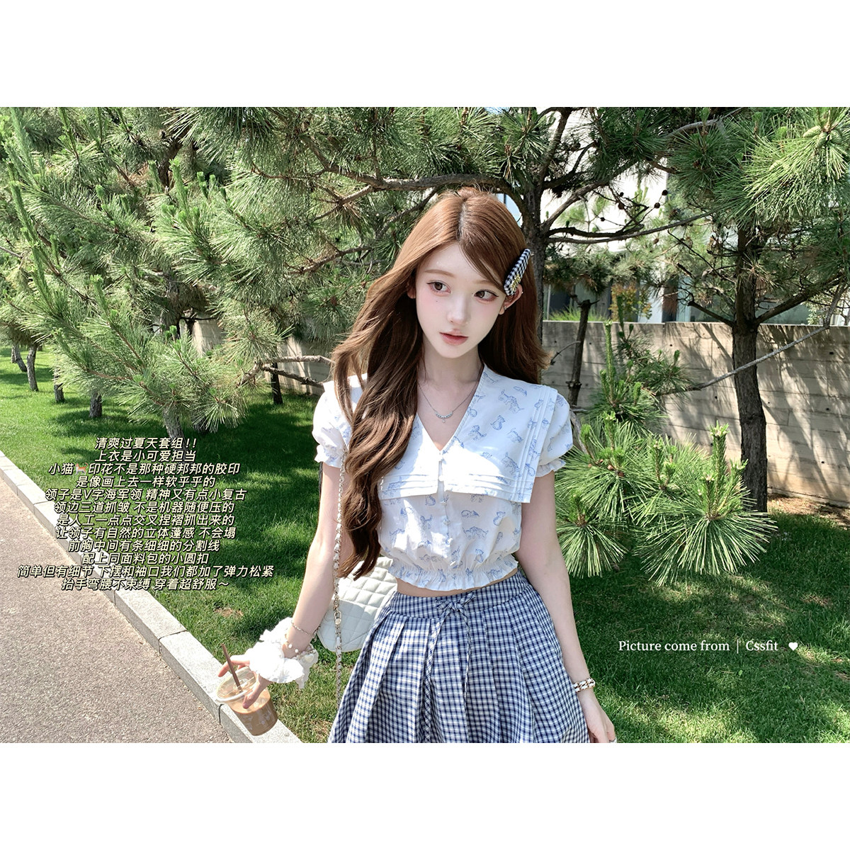 格纹百褶拼色中裙套装 迟伞伞25 纯棉猫咪印花短袖 kitten花园