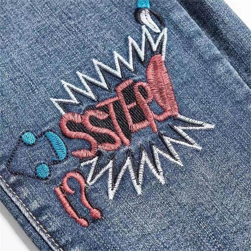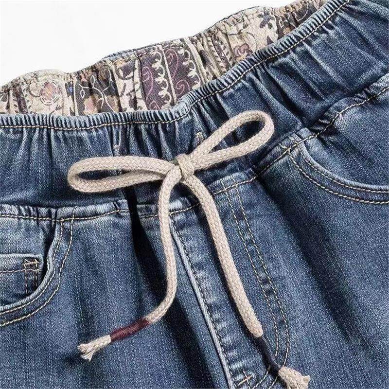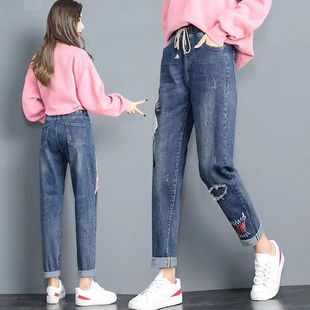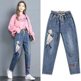 刺绣哈伦高腰显瘦老爹裤 大码 九分春秋季 胖mm松紧腰弹力宽松牛仔裤