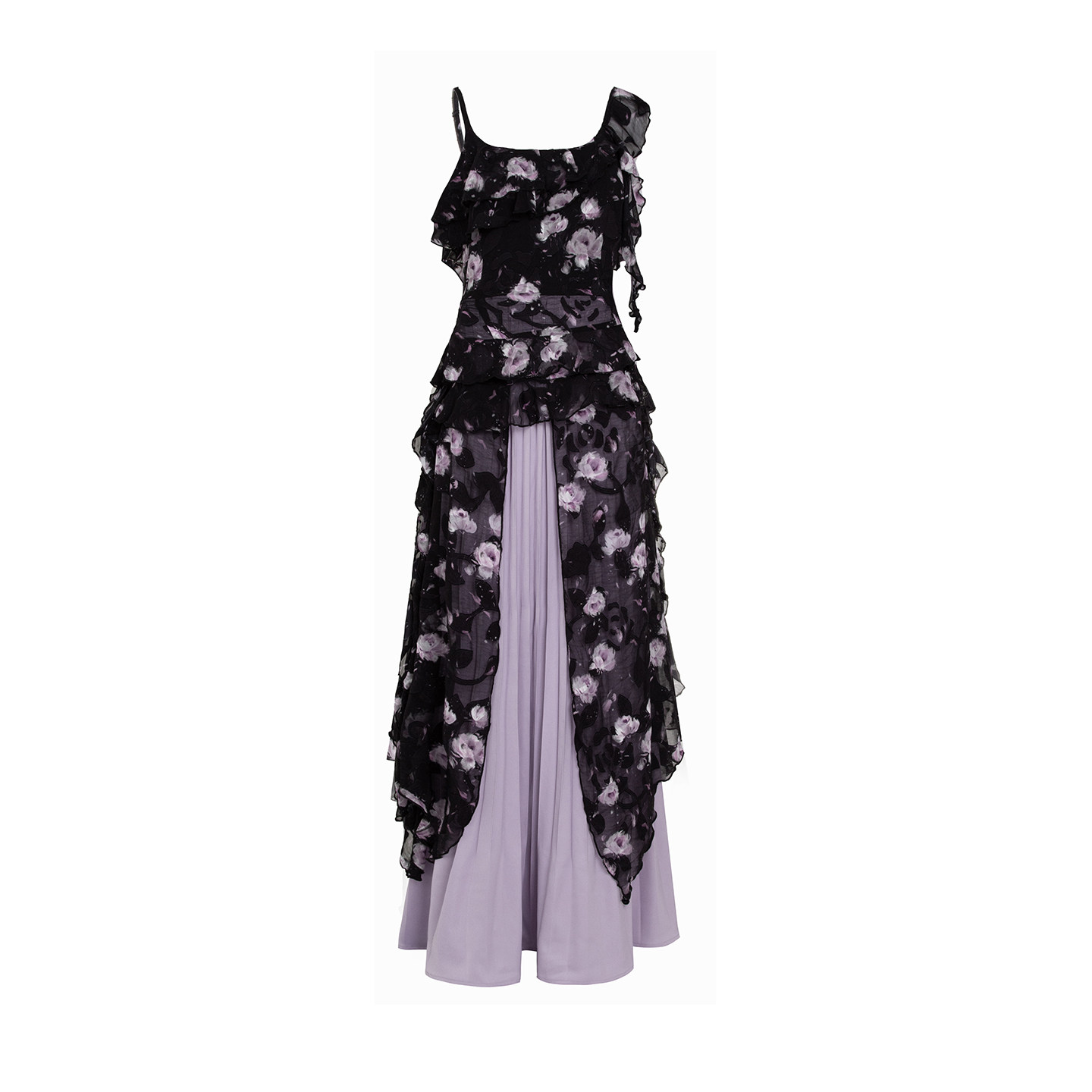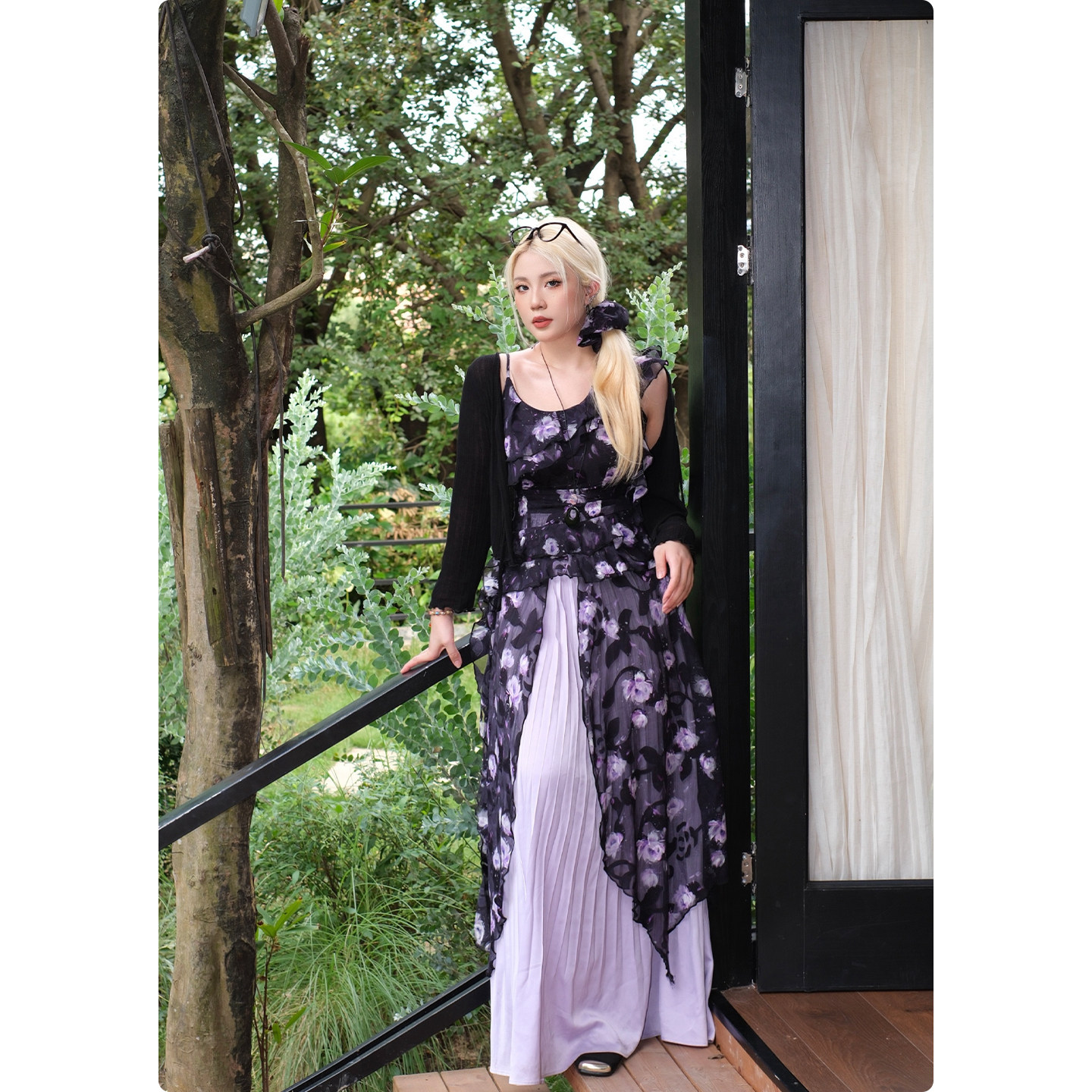 高级感吊带连衣裙显瘦收腰长裙碎花裙子 法式 糯米子 紫夜幽梦