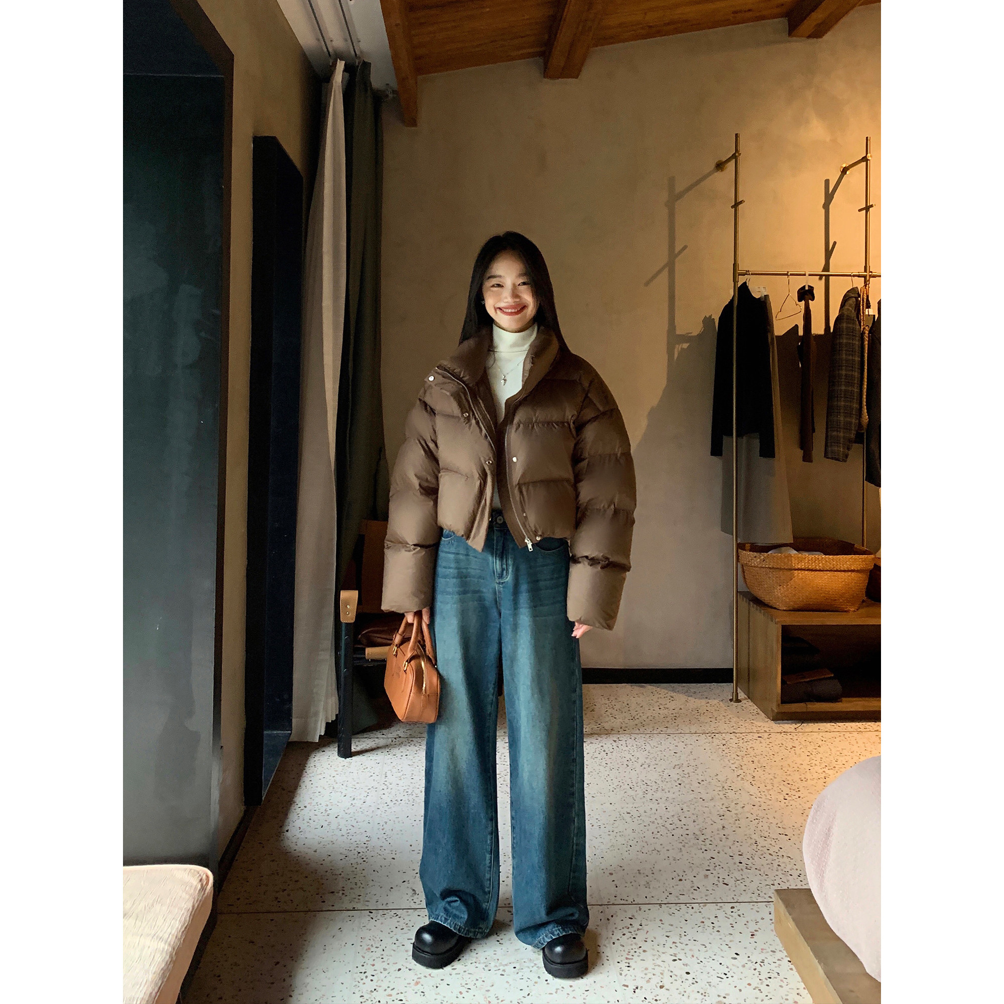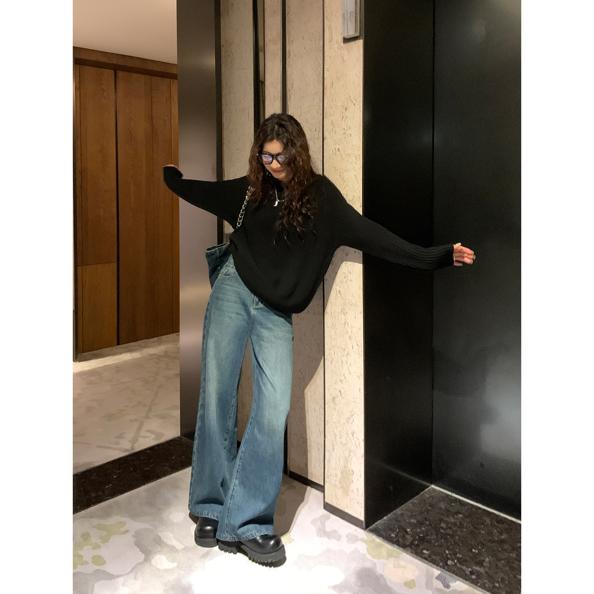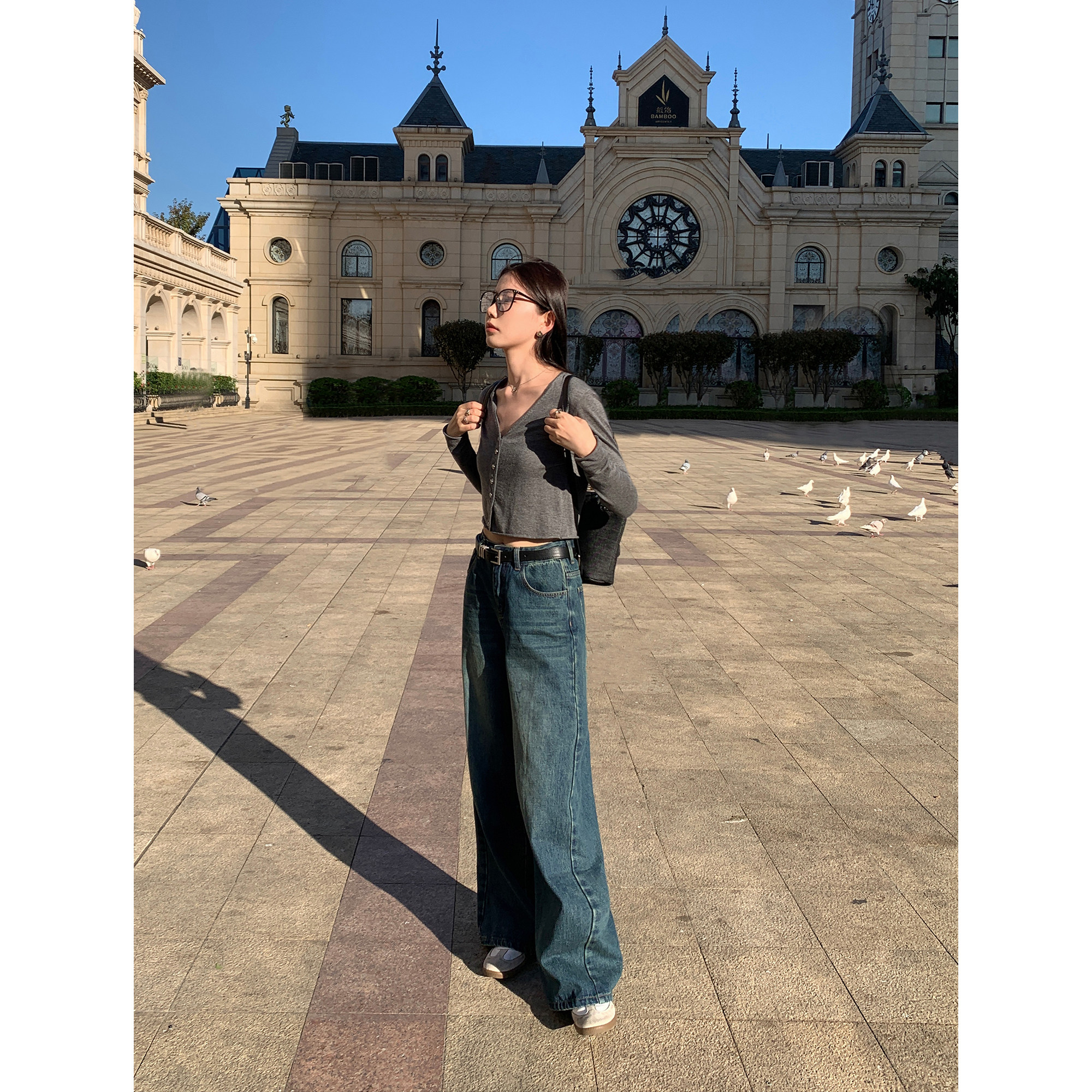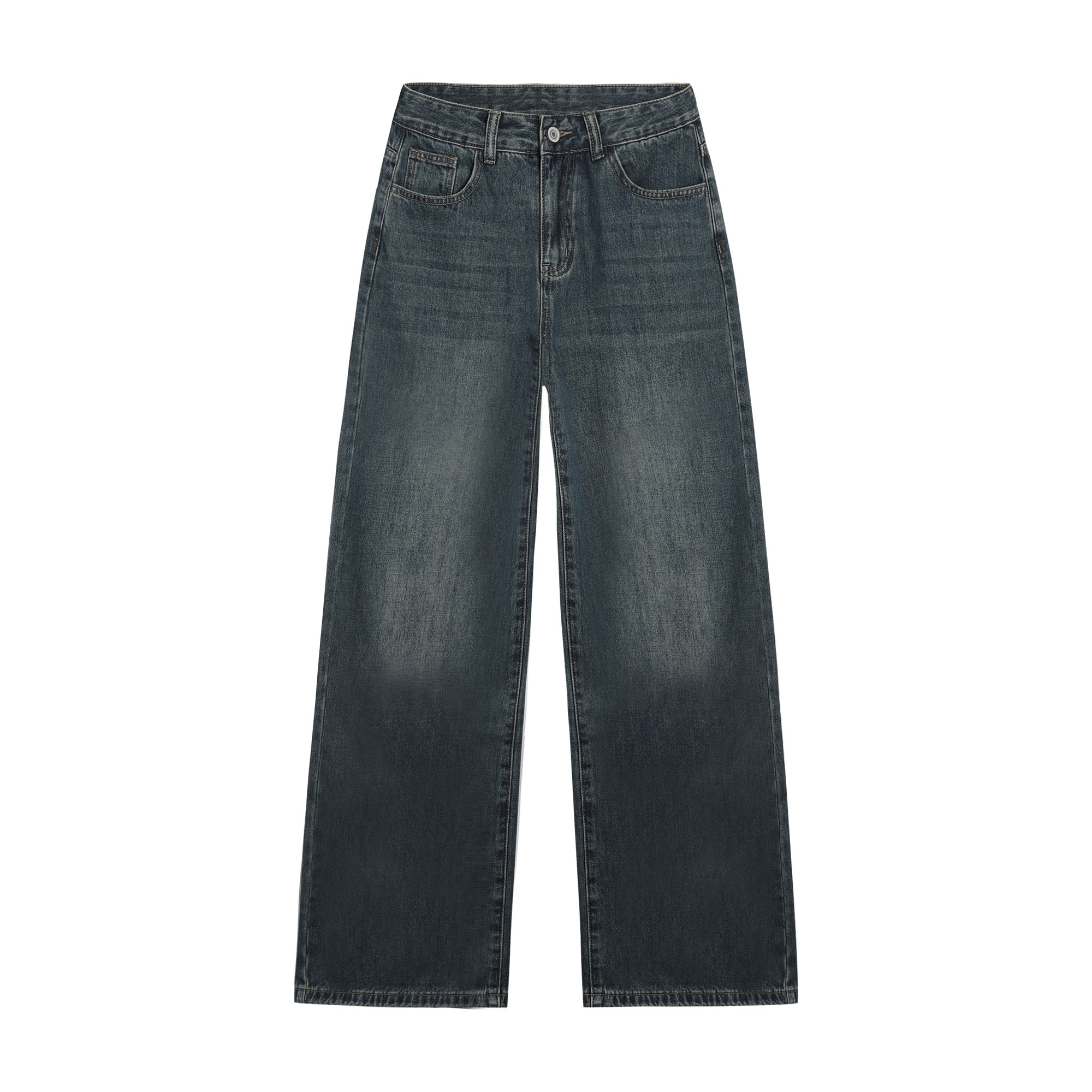 女高腰宽松小个子休闲裤 蓝色复古阔腿牛仔裤 子 无色清晨 pusumede