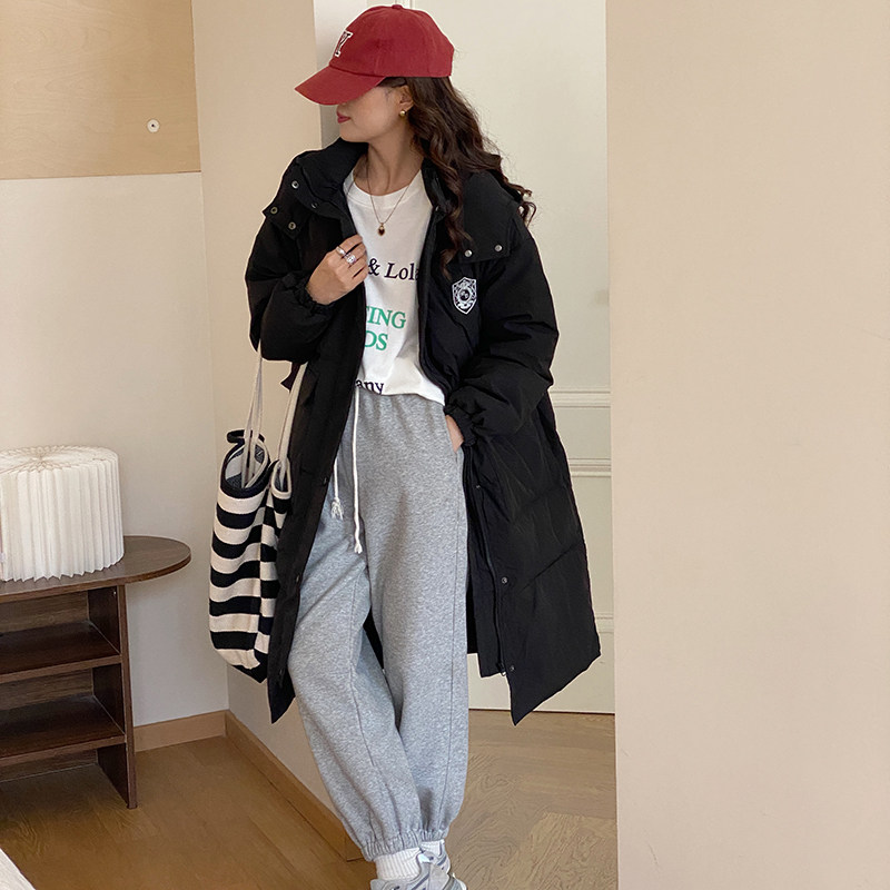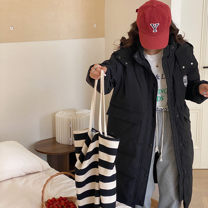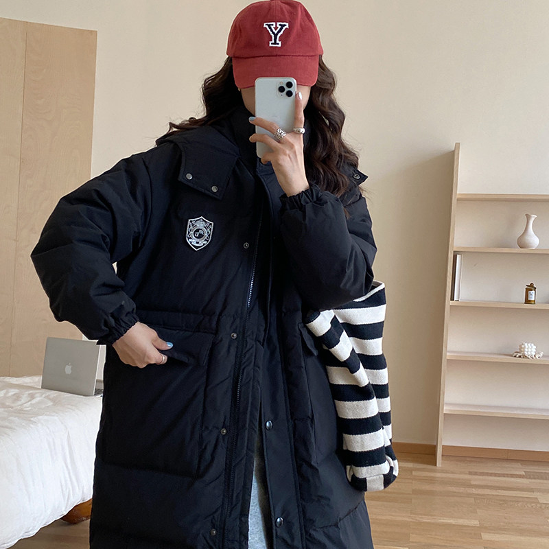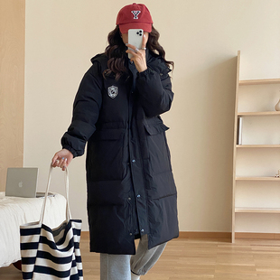 晴雨雪学院风黑色长款 过膝连帽加厚白鸭绒宽松冬外套 羽绒服女韩版