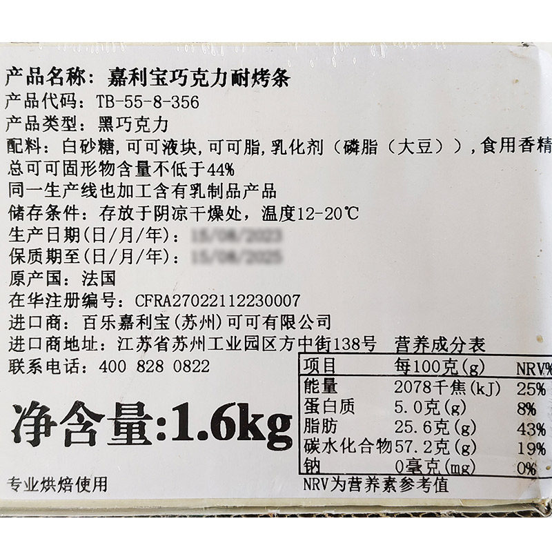 嘉利宝入炉巧克力条1.6kg装 法国比利时进口耐高温蛋糕烘焙原料