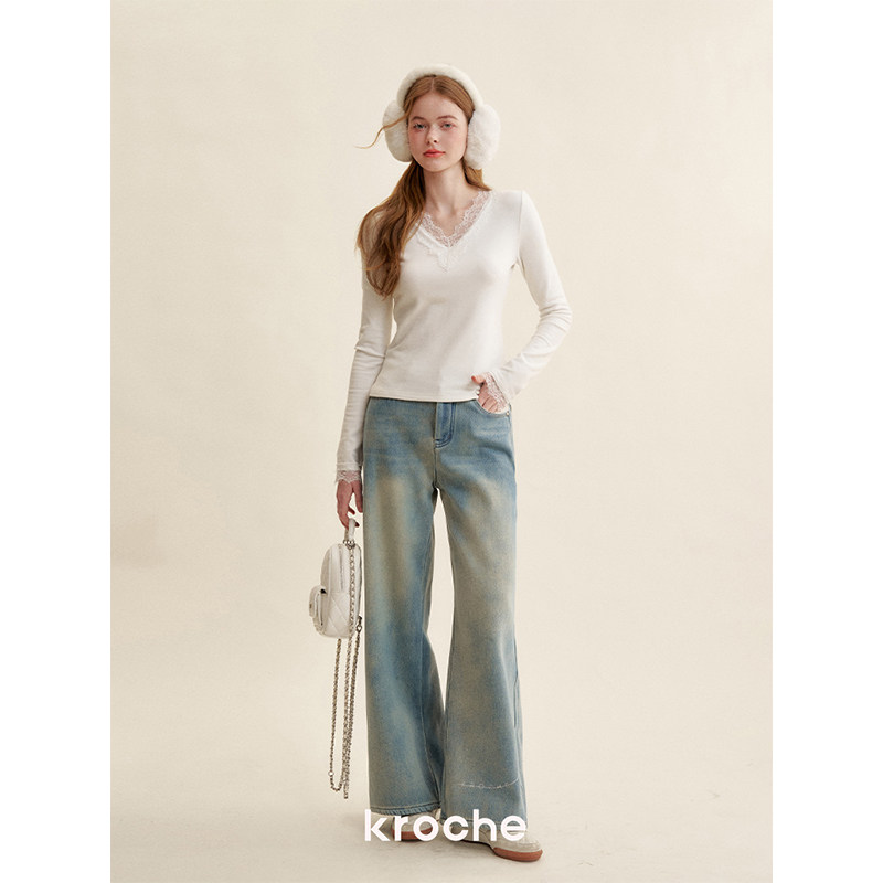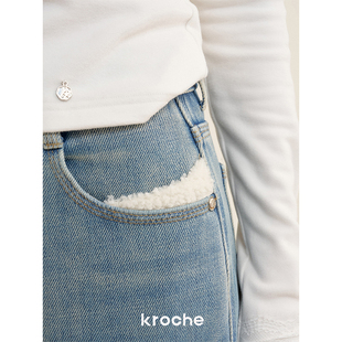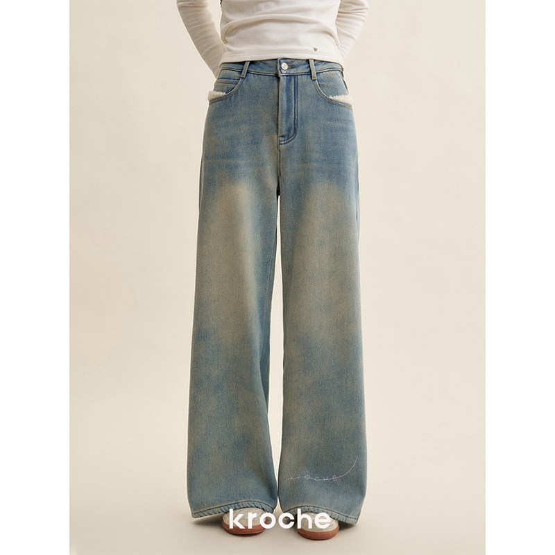 杏仁榛果定制人字纹面料慵懒随意加绒直筒牛仔裤 shop yaya Here