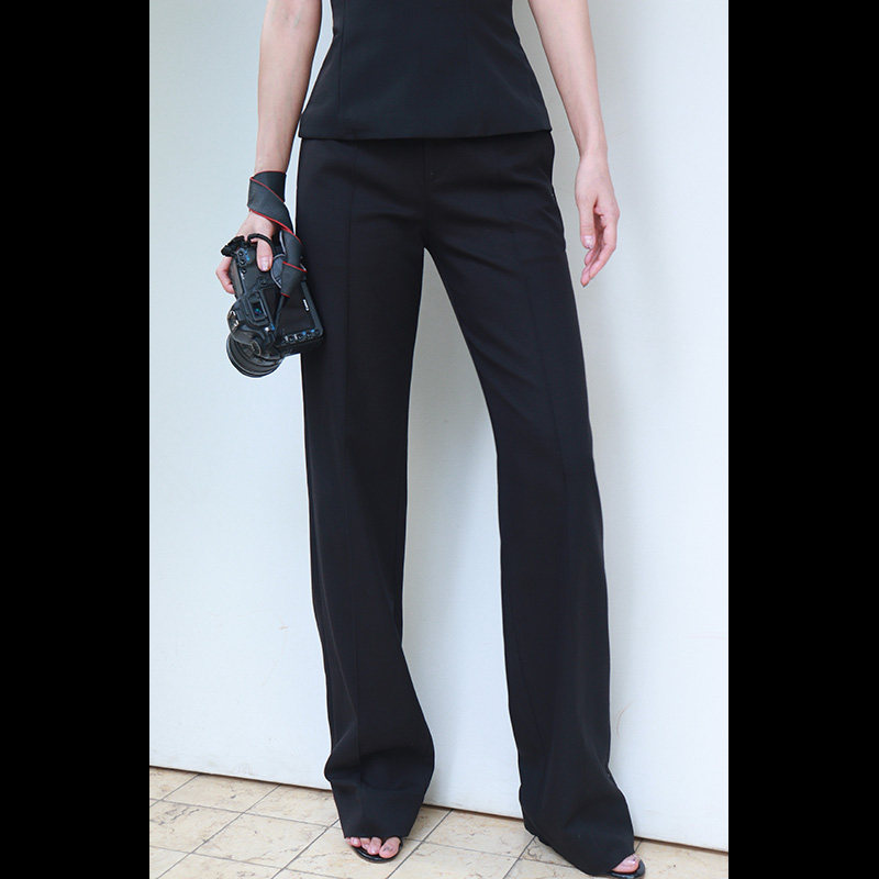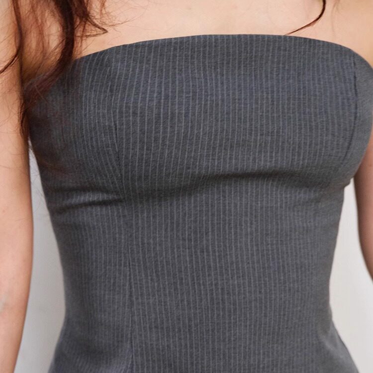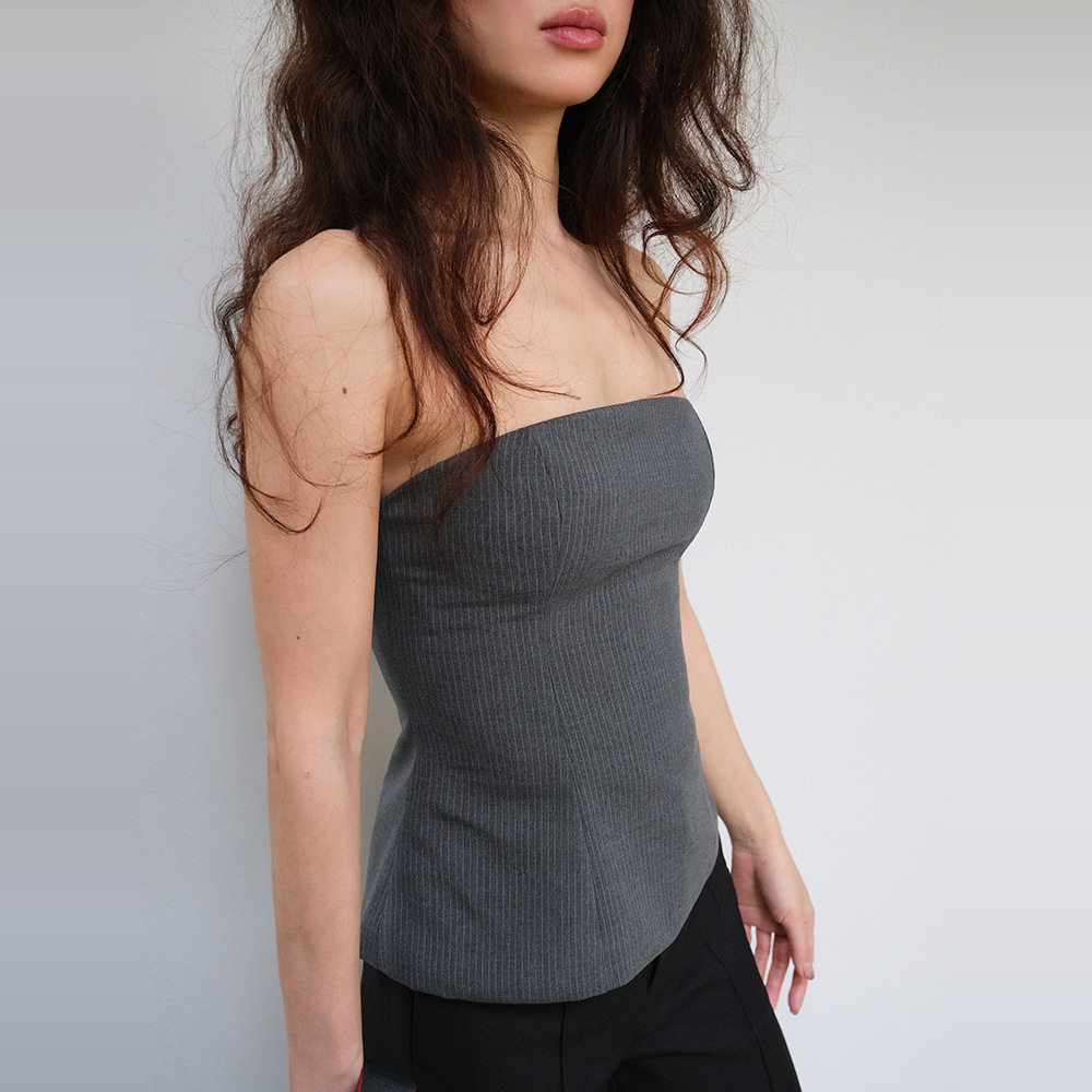 两件套灰条纹直筒西裤 LISAYU2015黑色马甲名媛套装 抹胸紧身西裤