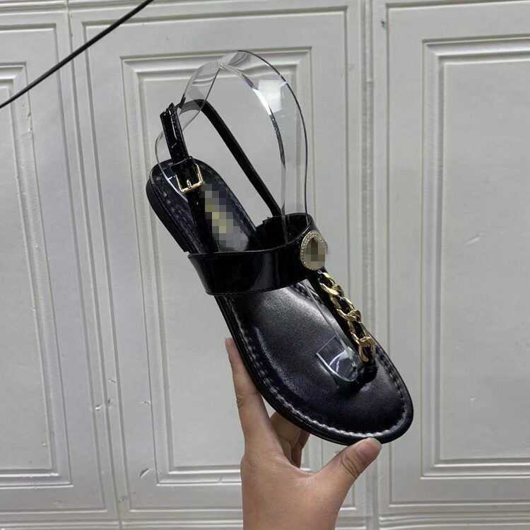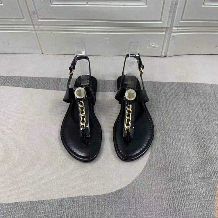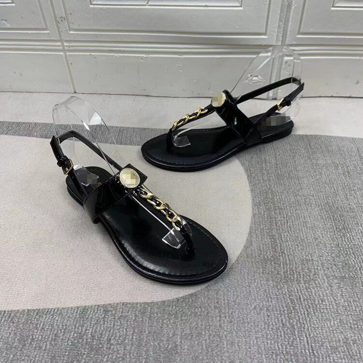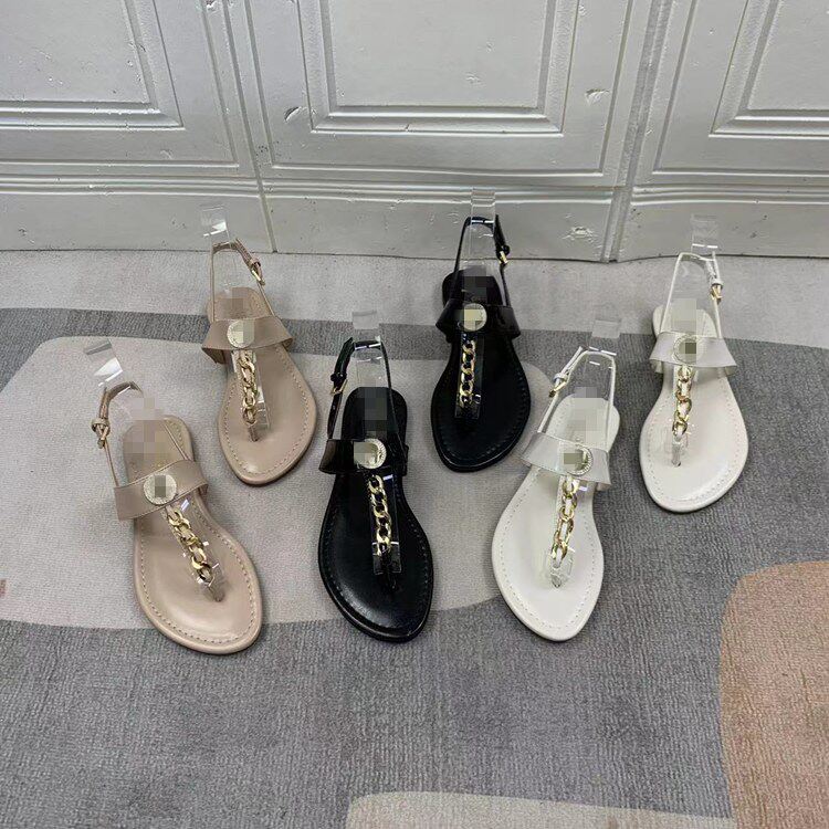 百搭淑女夹趾凉鞋 外贸原单女鞋 圆头纯色平底金属链新款