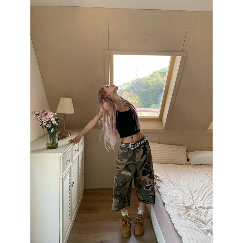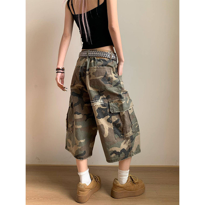 男女宽松休闲短裤 破洞补丁直筒迷彩七分裤 美式 NECOYEP2025春季