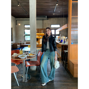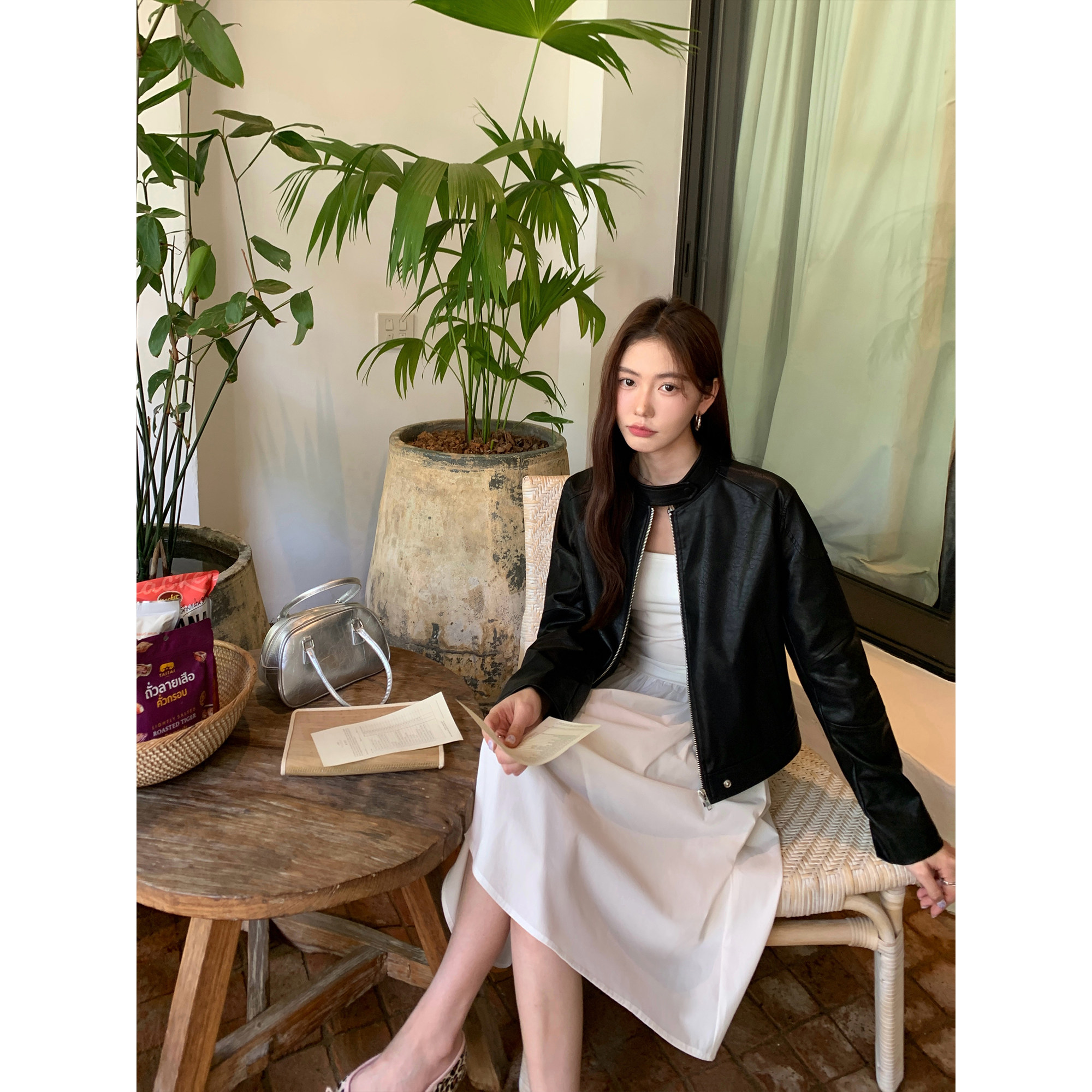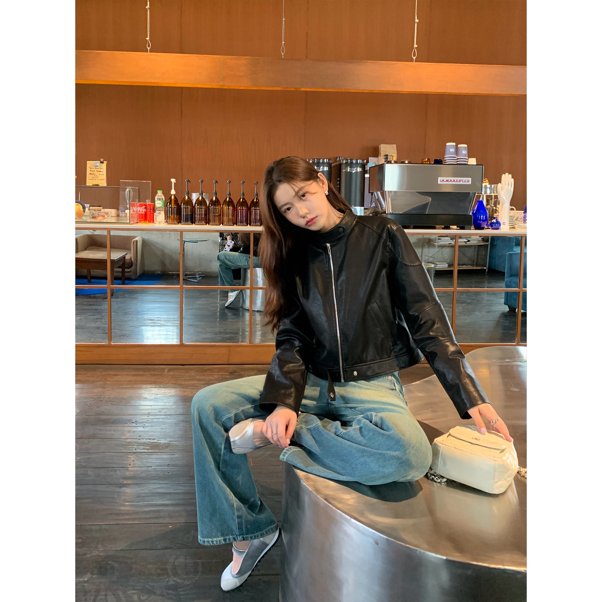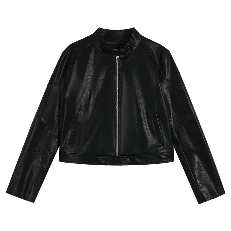 拉链正肩复古上衣 黑色立领pu皮衣外套女短款 pusumede 现货7折