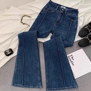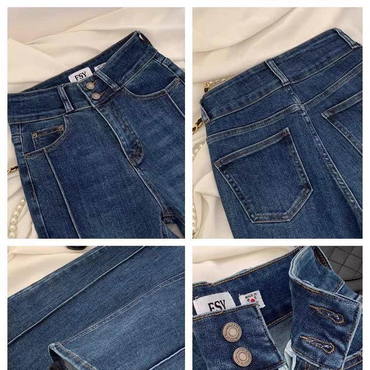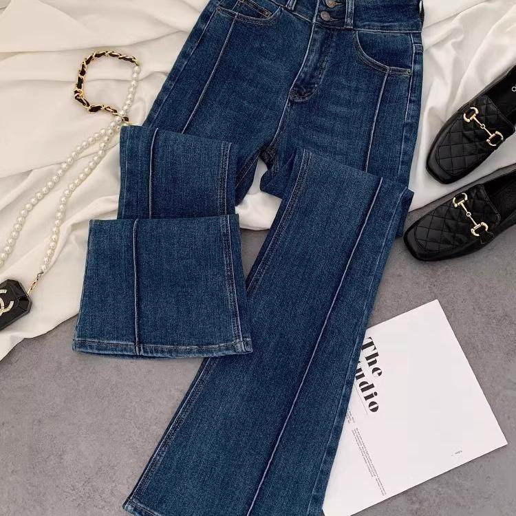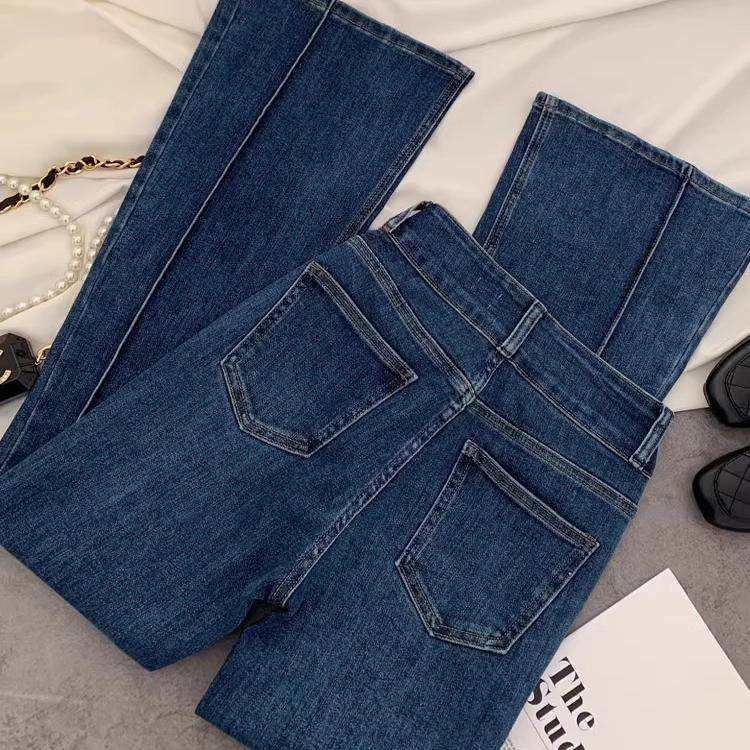 2025春季 韩国原单洋气高腰百搭显瘦双扣微喇裤 复古蓝色弹力喇叭裤