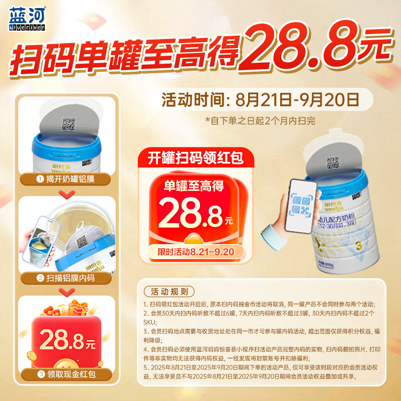 36月 蓝河姆阿普奶粉3段幼儿奶粉适度水解800g适用12 6罐扫码 得64