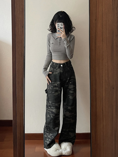 宽松显瘦拖地直筒裤 2025新款 子 女秋冬季 美拉德高腰加绒阔腿牛仔裤