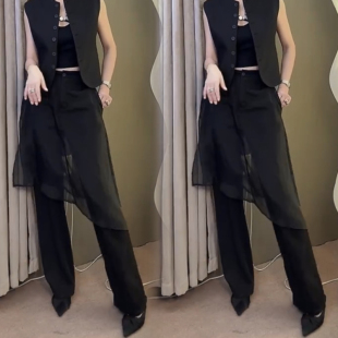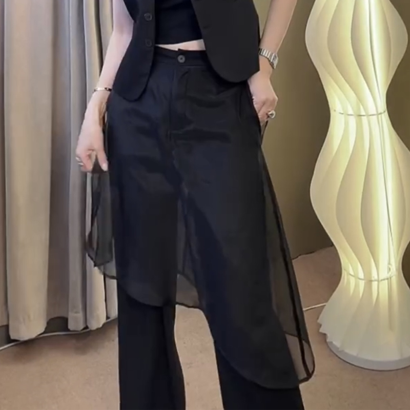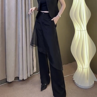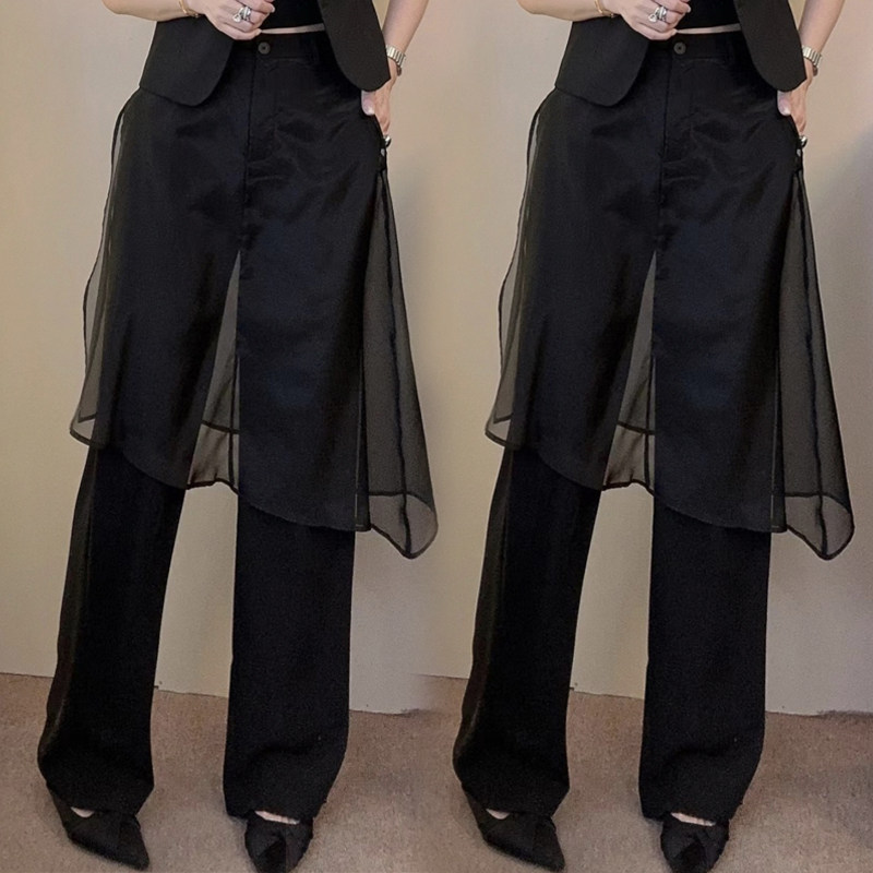 春秋OL风时髦洋气直筒裤 女弹力百搭休闲裤 拼纱围裙阔腿裤 欧货新款