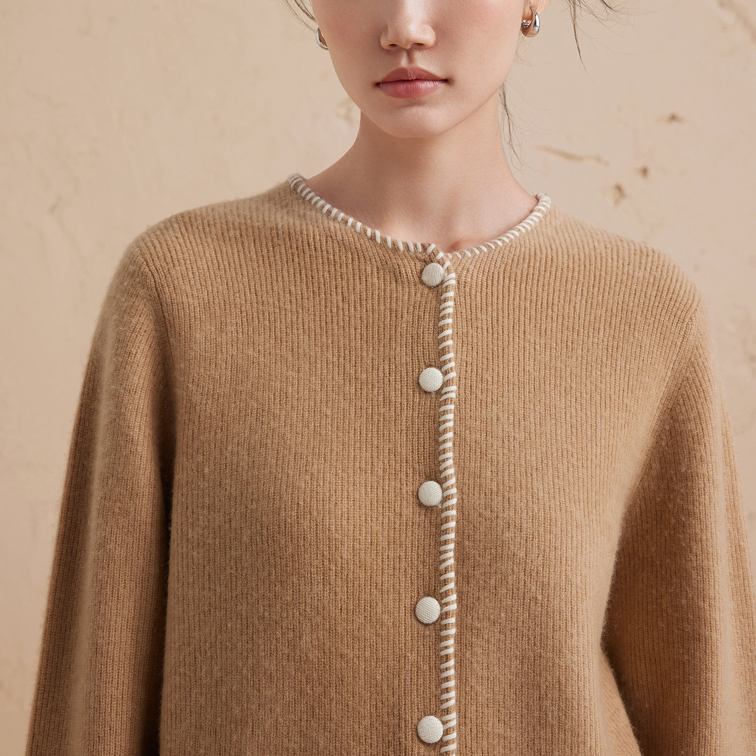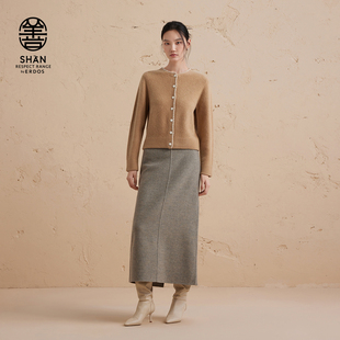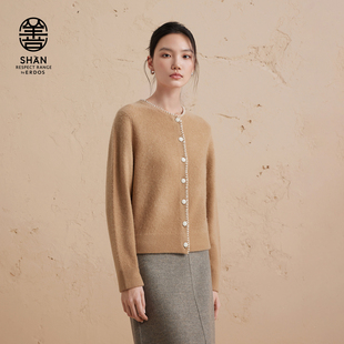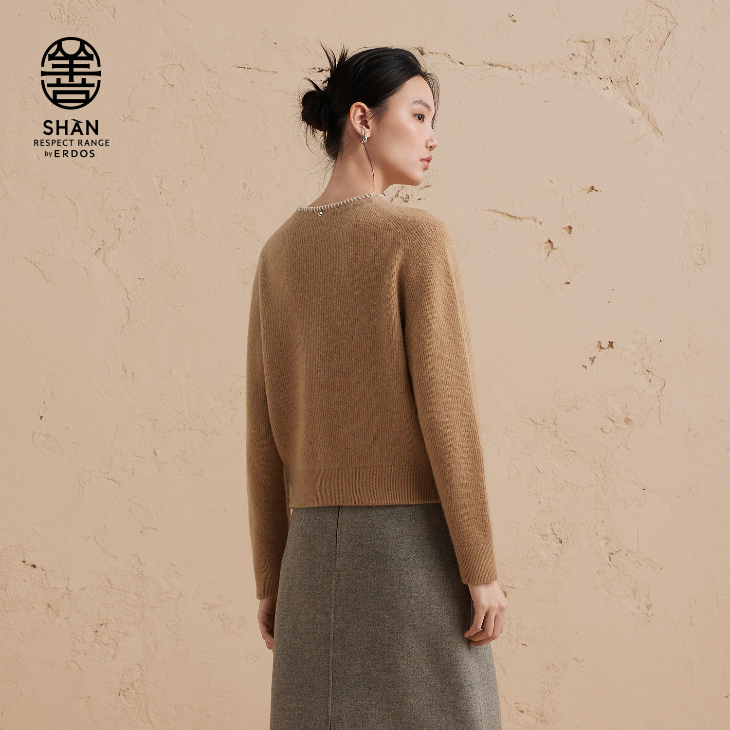 圆领羊绒针织开衫 ERDOS 女秋绿色单畦拉绒毛衣 初绒