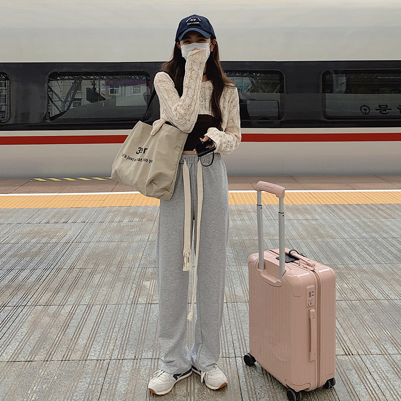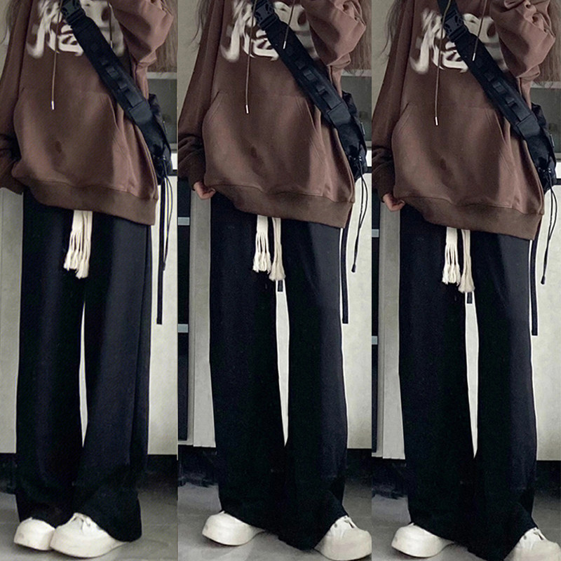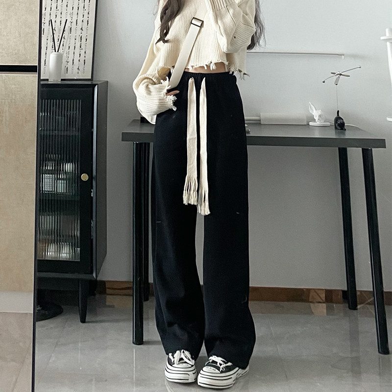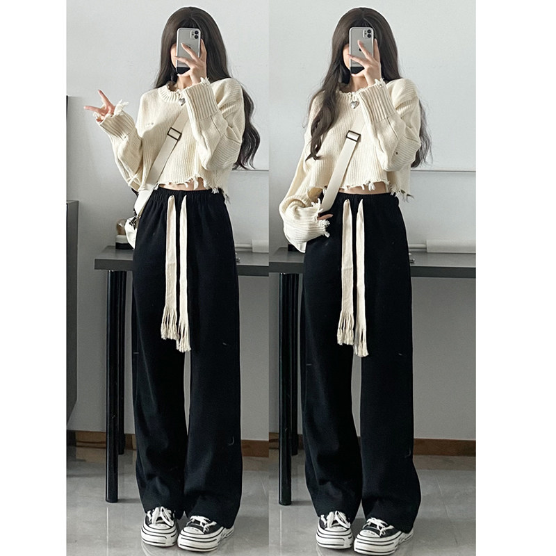 加绒小个子运动裤 黑色针织阔腿裤 女秋冬高腰垂感宽松直筒休闲卫裤
