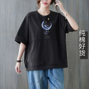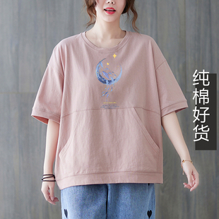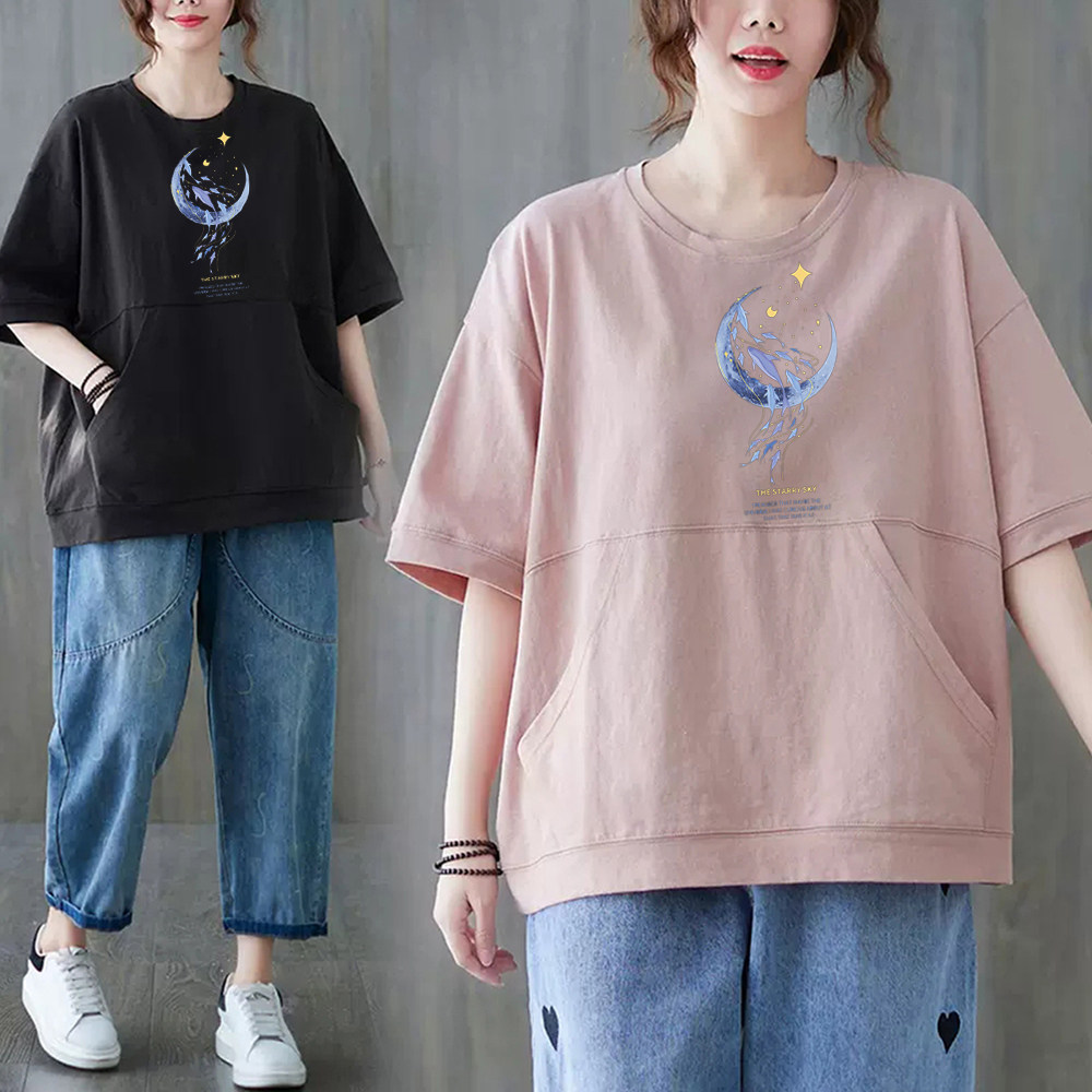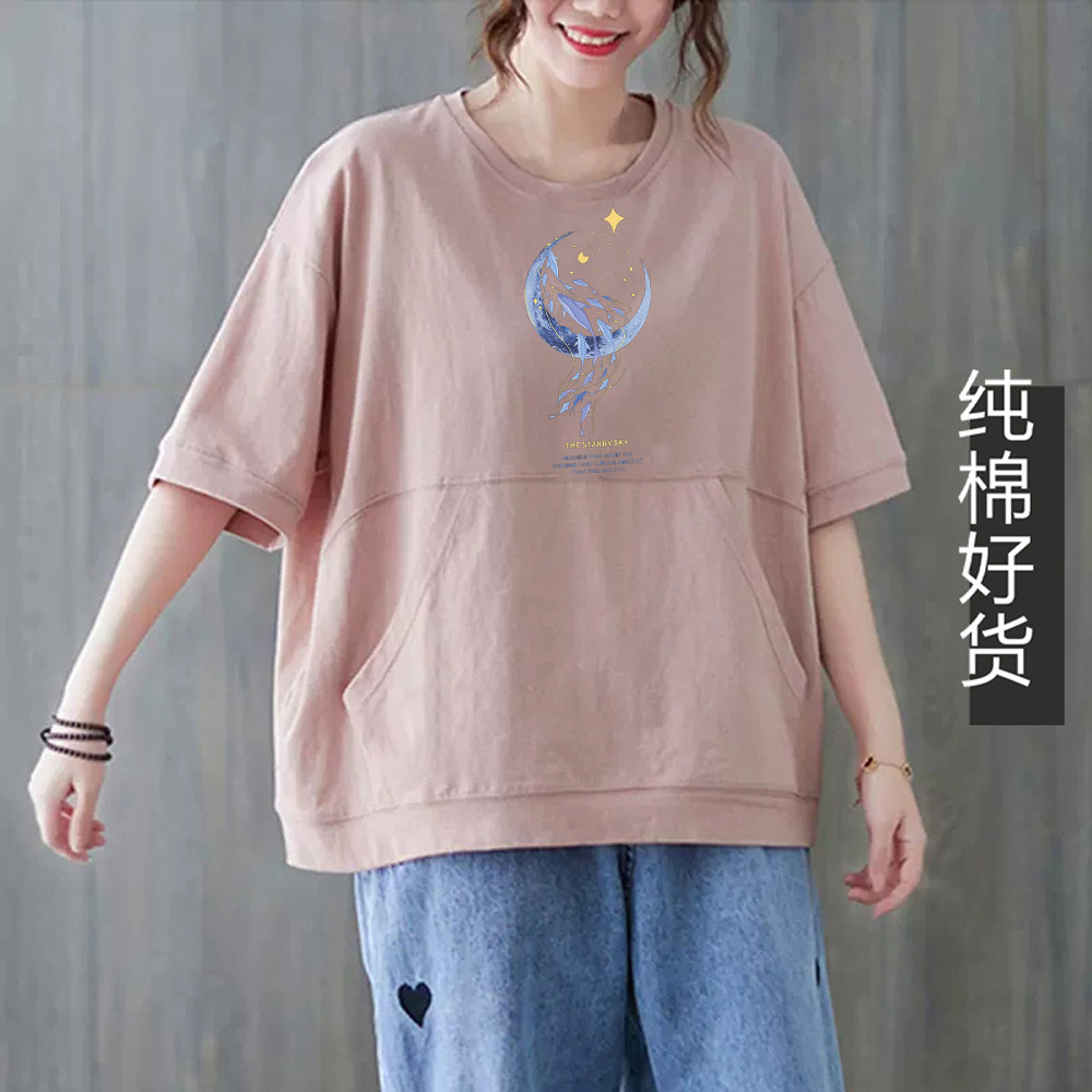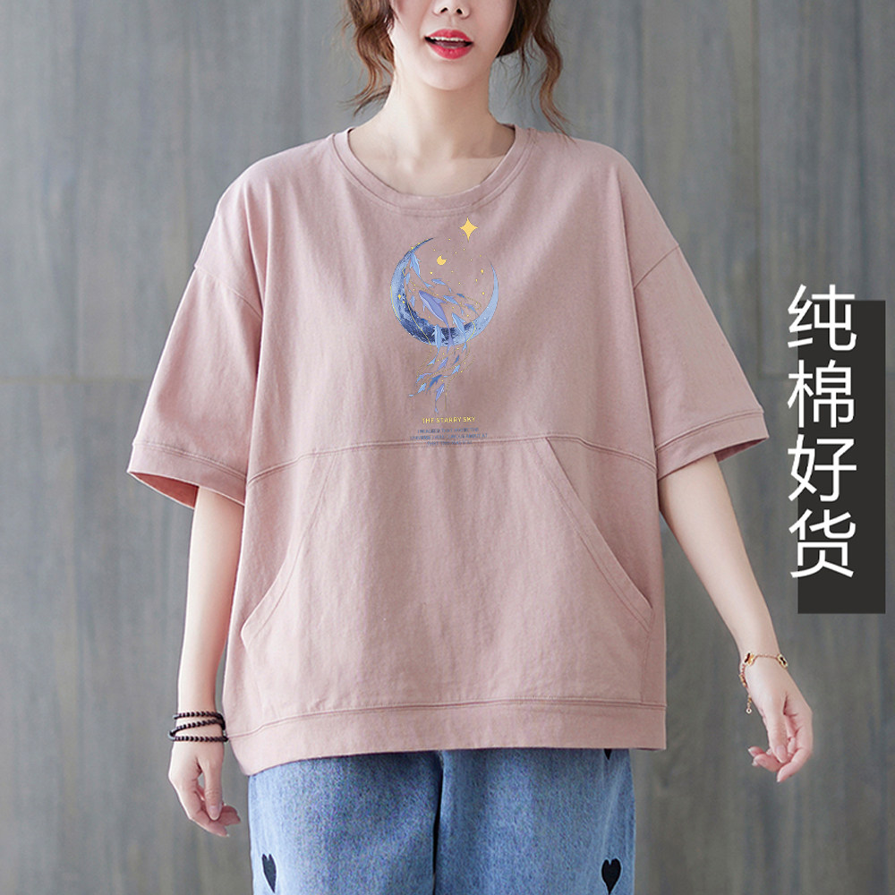 圆领纯棉印花胖MM口袋短袖 外贸欧货女装 大码 宽松时尚 体恤上衣 夏季
