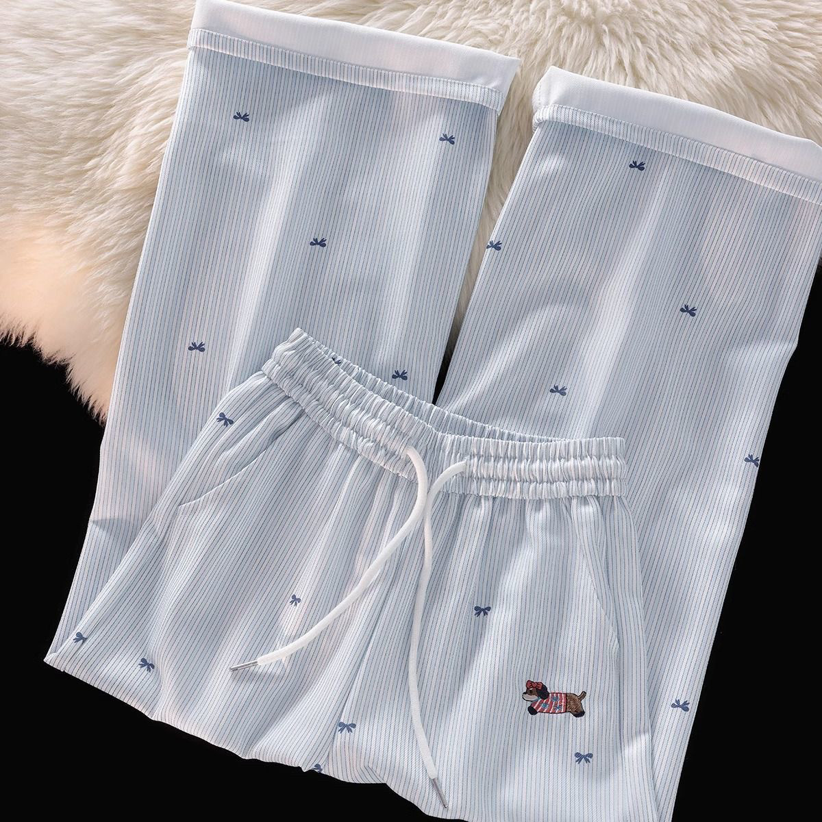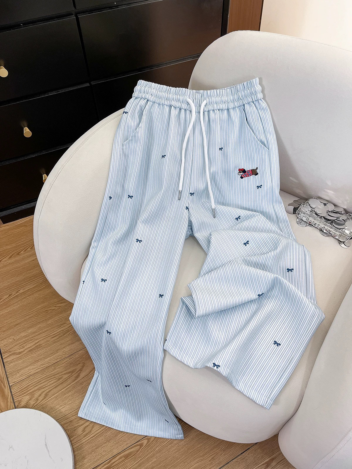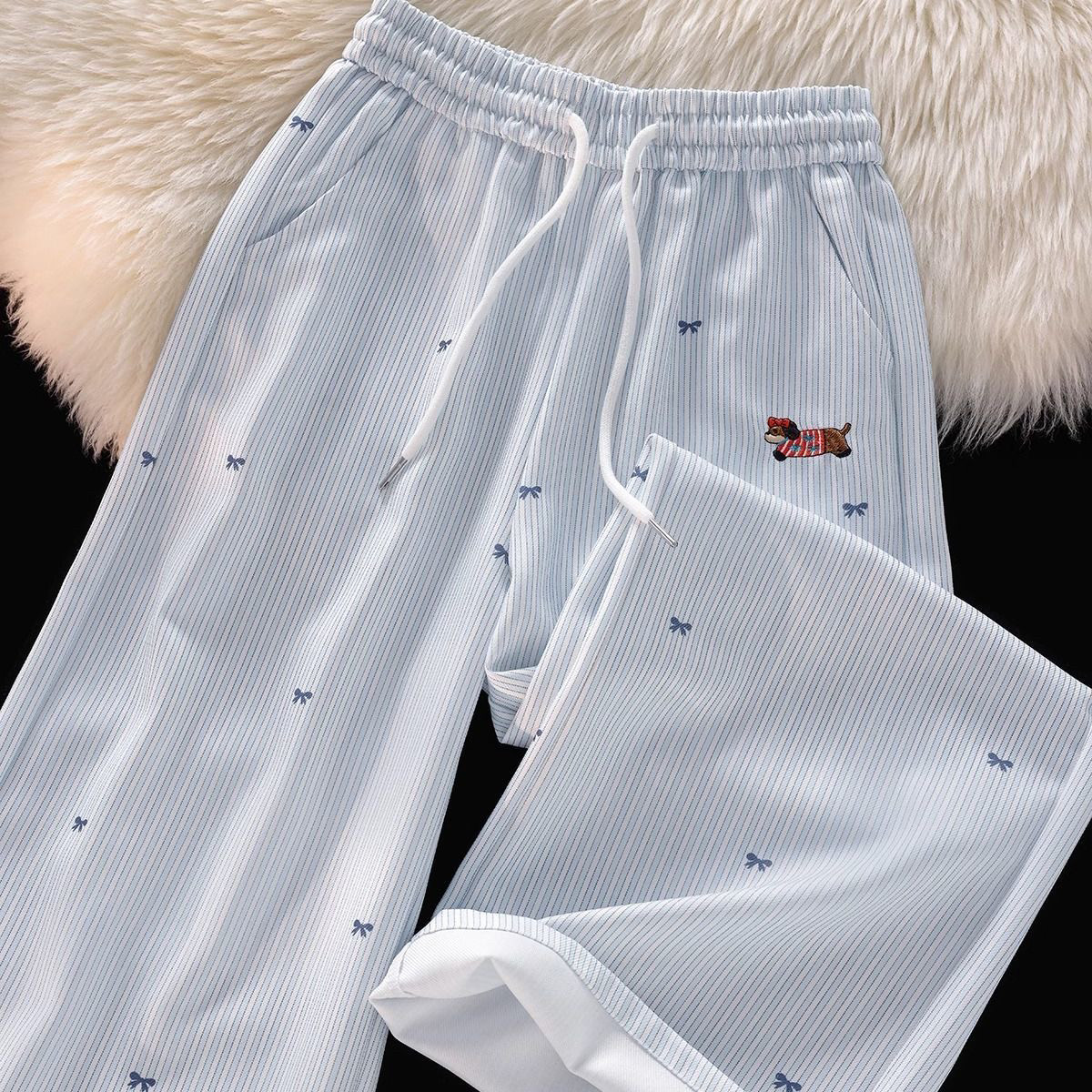 松弛感长裤 通勤韩版 高腰显瘦 女2025夏季 蓝色条纹设计感刺绣休闲裤