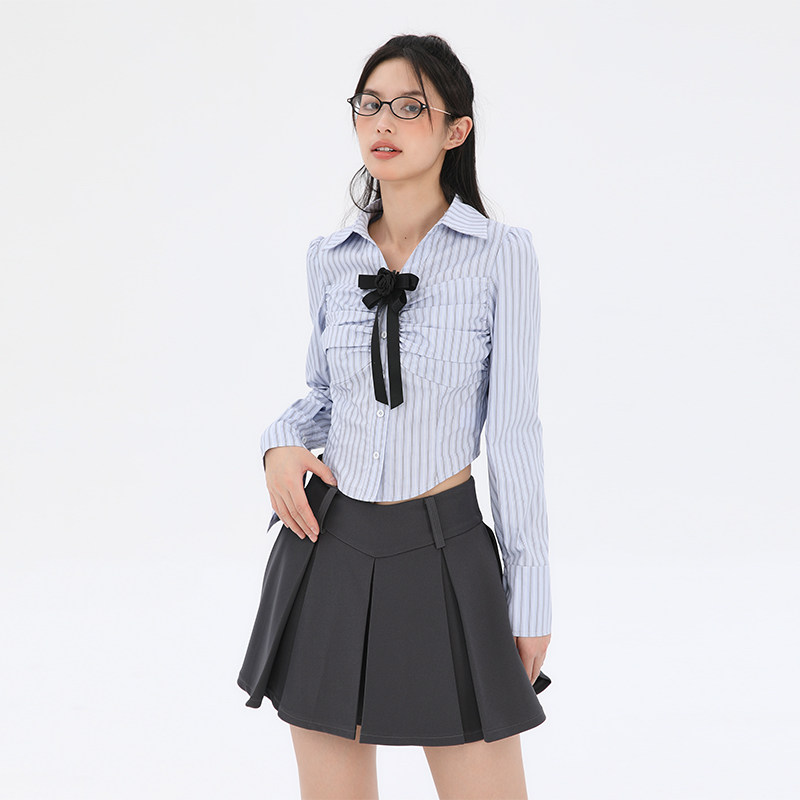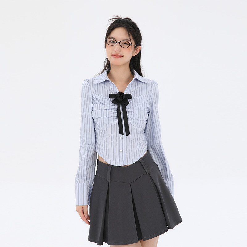 小众设计感时尚 Pink 抽褶条纹衬衫 新款 气质衬衣翻领上衣 Ers秋季
