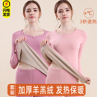 冬 打底棉毛衫 一体羊羔绒保暖内衣套装 女加绒加厚德绒发热秋衣秋裤