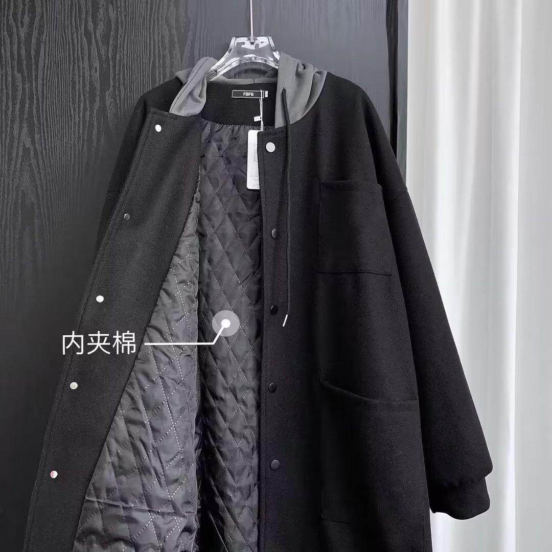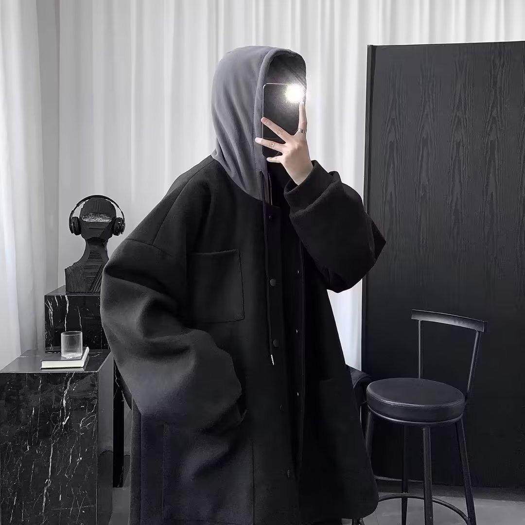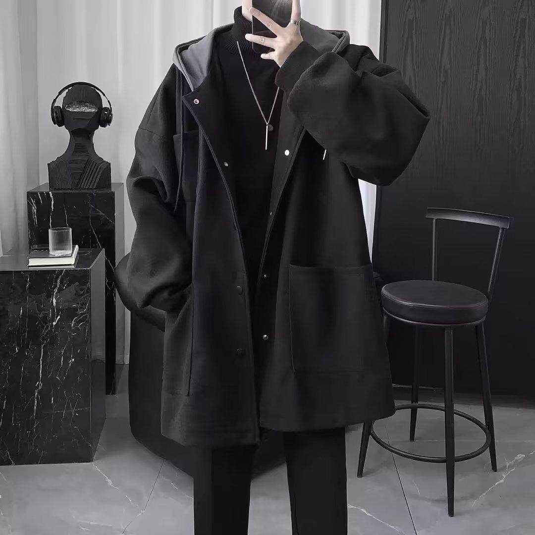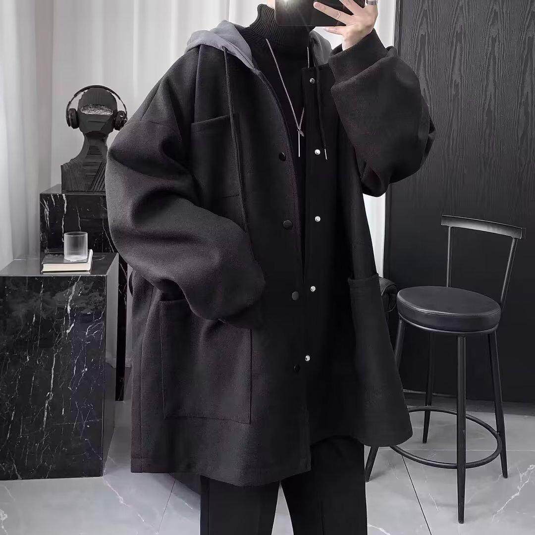 假两件连帽呢子外套男生套装 加厚潮流帅气港风宽松毛呢大衣中长款