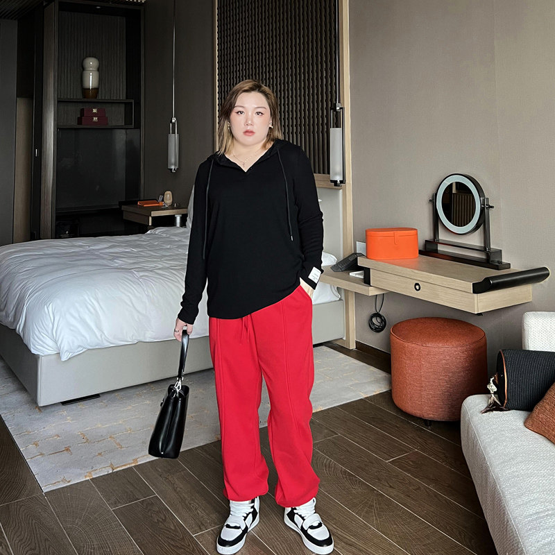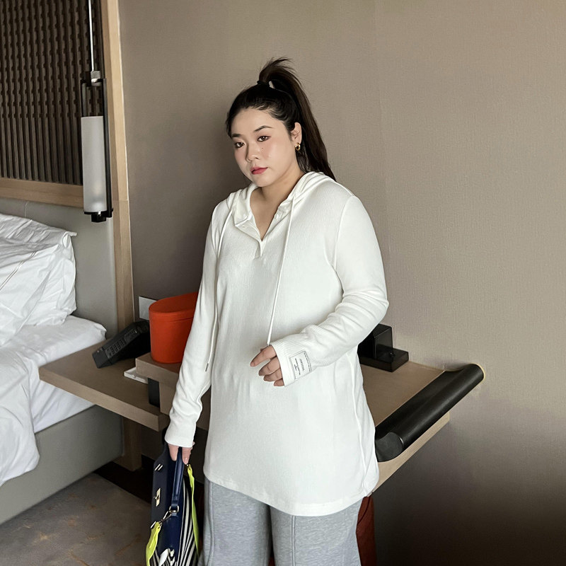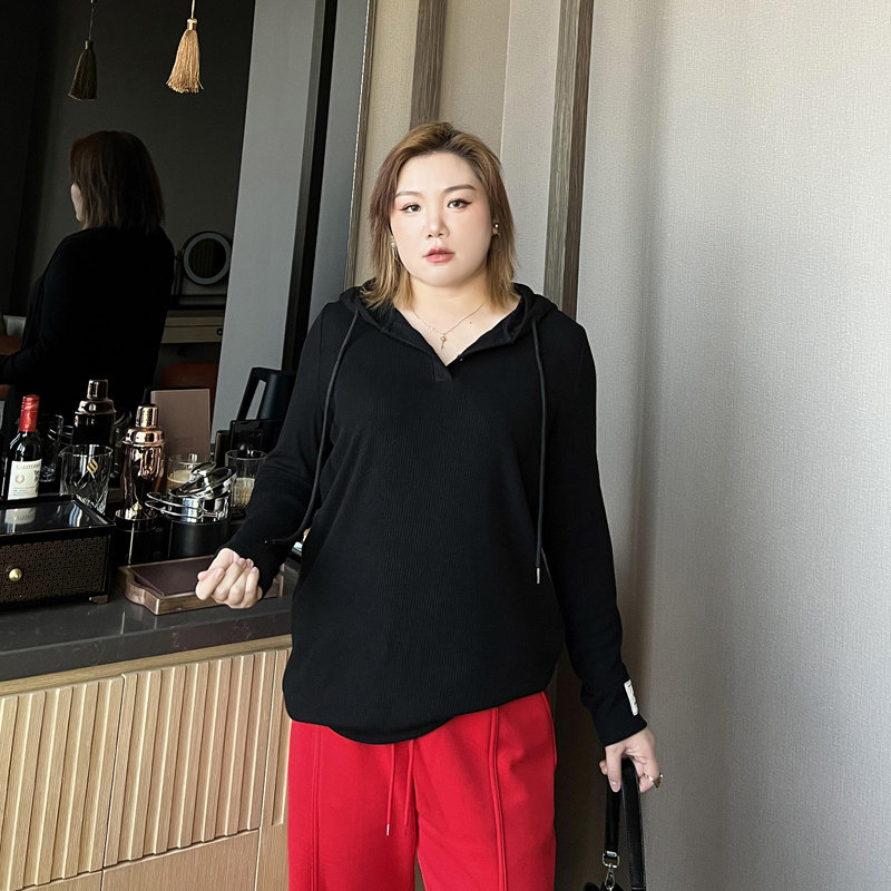 秋冬胖mm宽松加肥加大长袖 大码 中长款 连帽针织衫 打底T恤上衣 女装