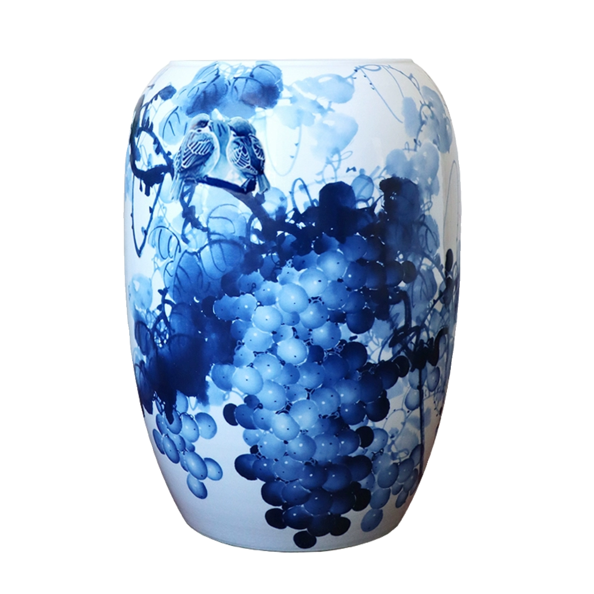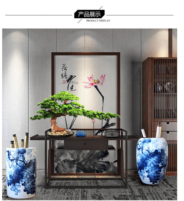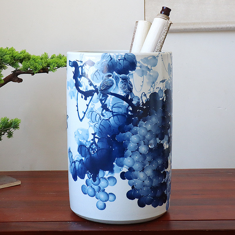 景德镇陶瓷花瓶书房书画缸卷轴缸字画缸画筒摆件中式 青花瓷葡萄