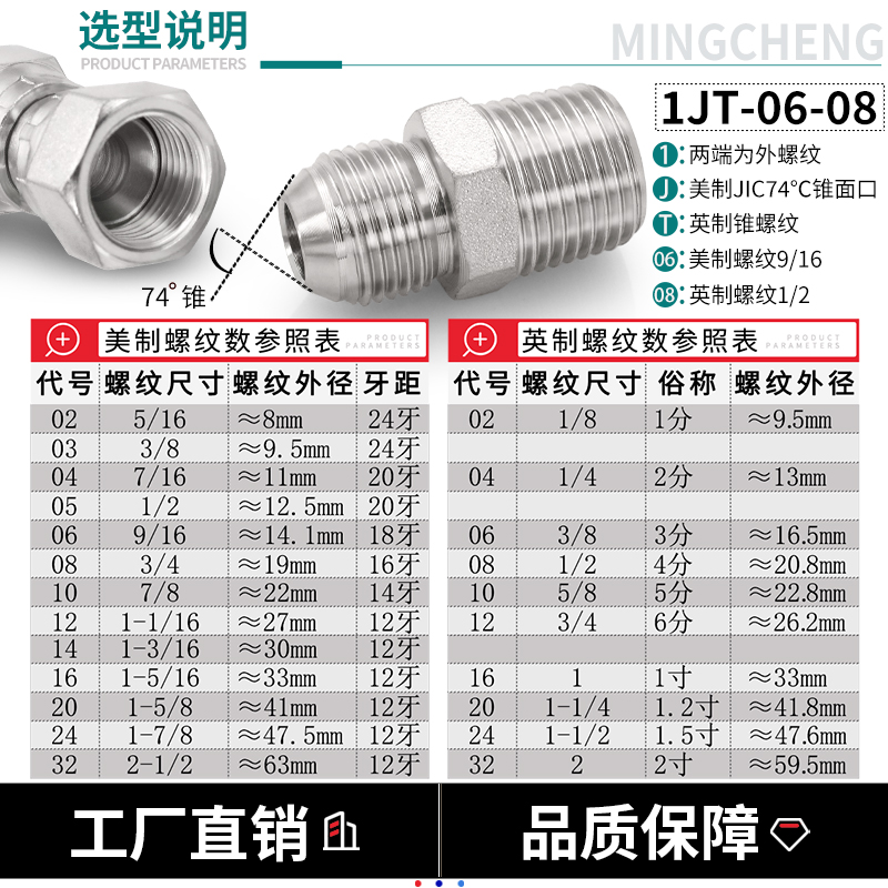 直通过渡接头美制JIC外螺纹74°外锥 英制外螺纹胶垫ED密封1JB