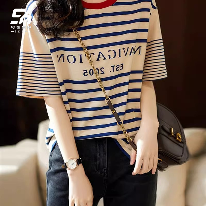 字母印花透气宽松圆领半袖 新款 体恤上衣 t恤女条纹2025年夏季 短袖