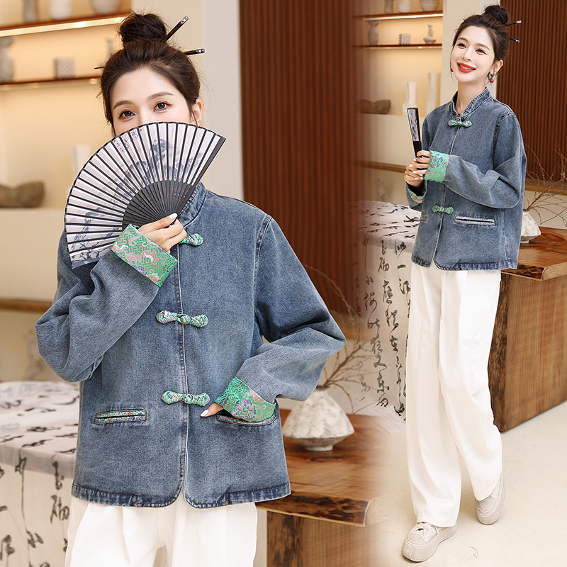 女装 2025新款 中国风复古盘扣刺绣初春上衣 牛仔外套女春秋款 新中式