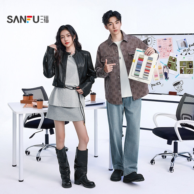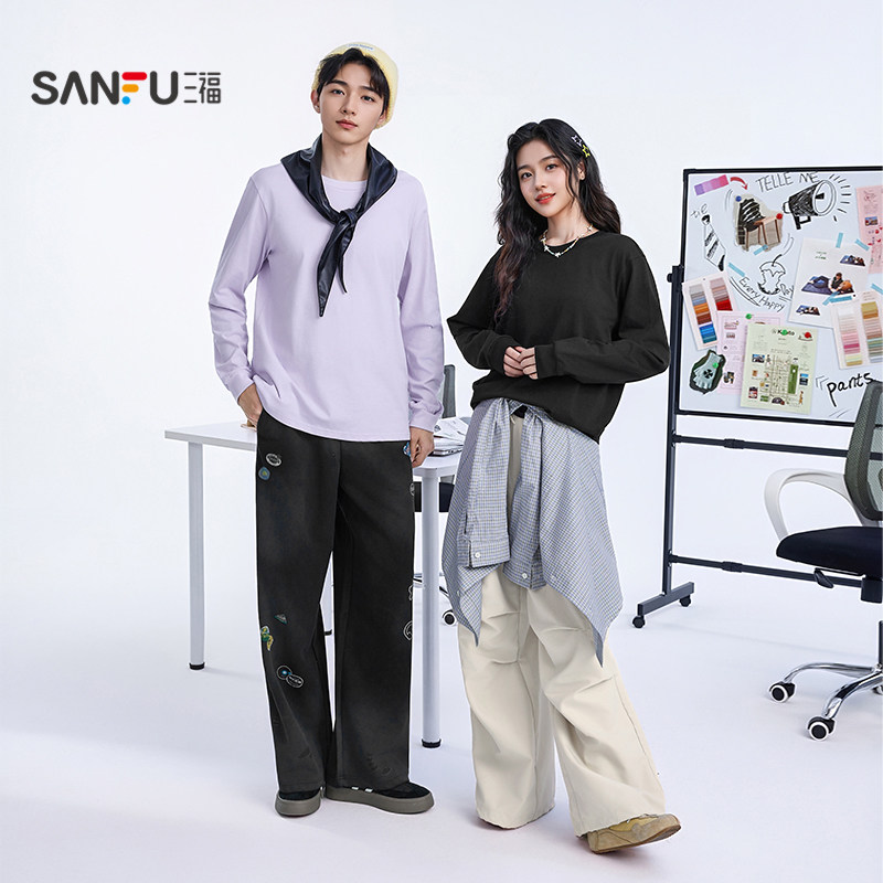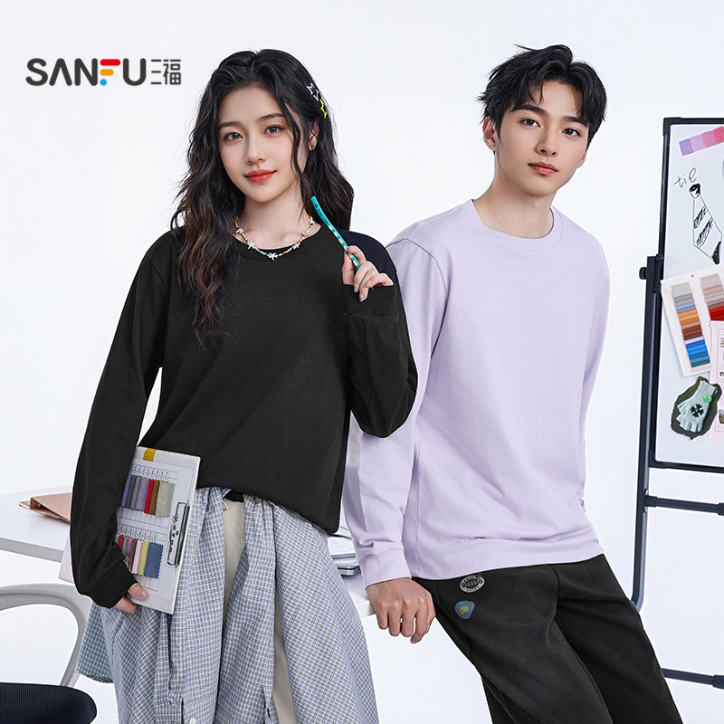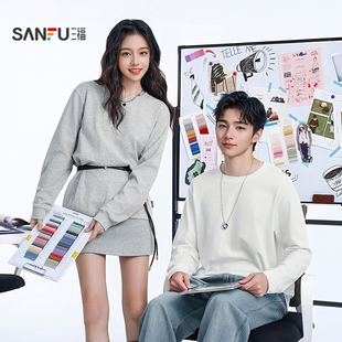 休闲下摆小标宽松圆领上衣 t恤男纯色情侣款 三福2025秋冬新款 长袖