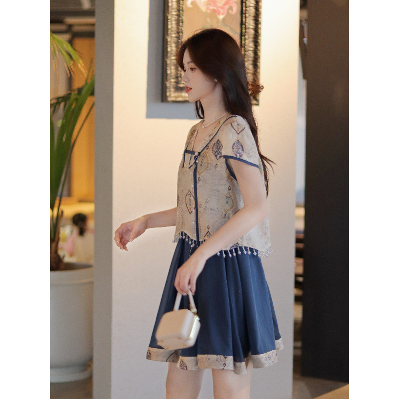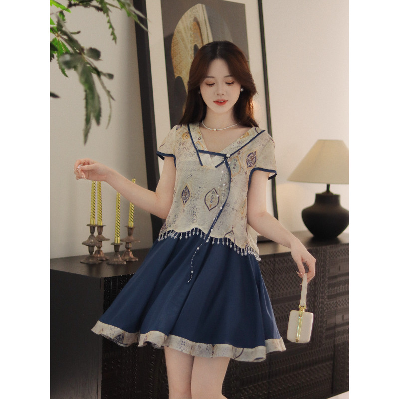 吊带裙子两件套 藏蓝短裙海边度假汉服新中式 瑶西 蓝鹊