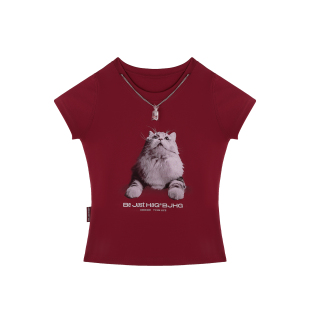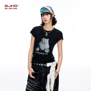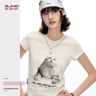 上衣半袖 BJHG不计后果小猫抓鱼T恤短袖 修身 夏季 凉感正肩t恤女 女款