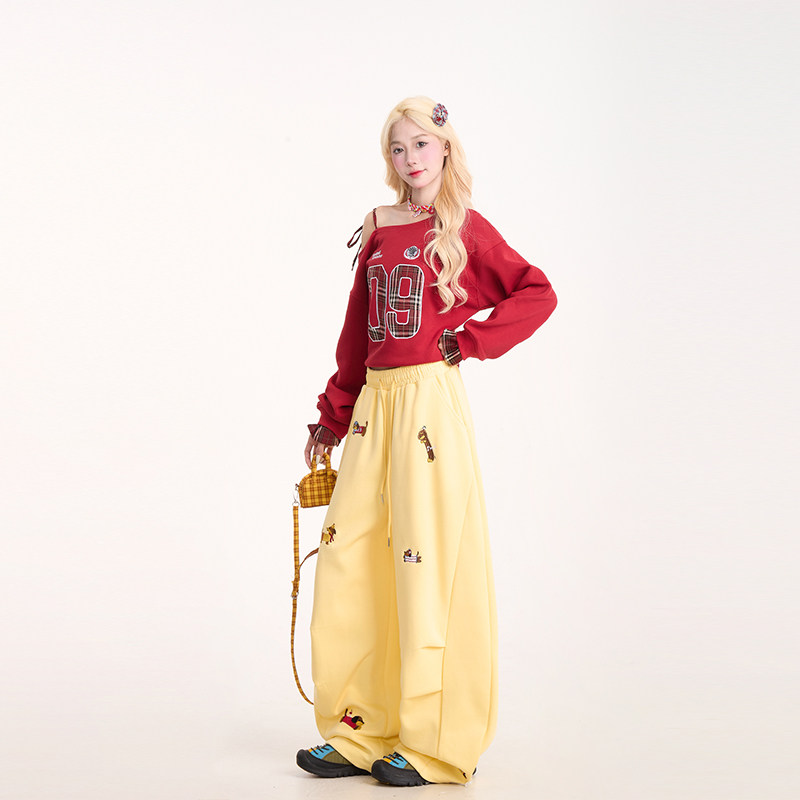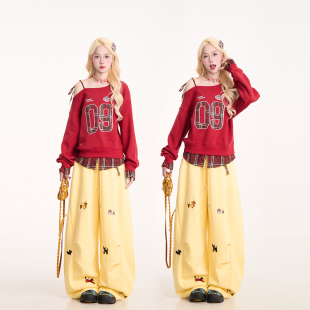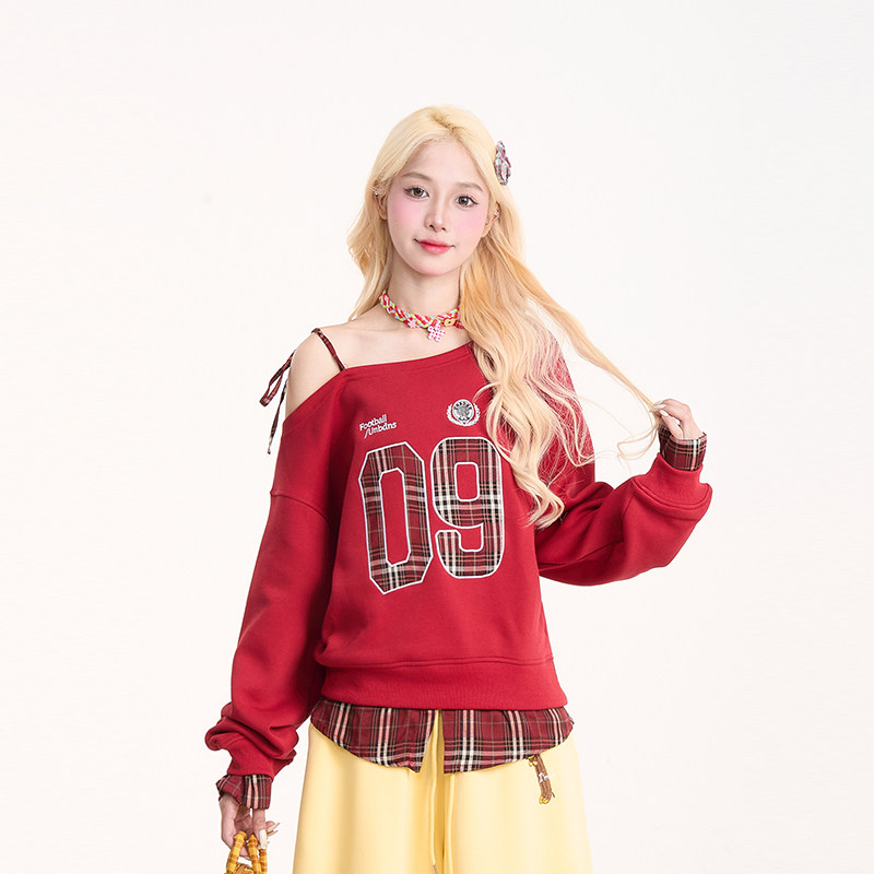 宽松吊带长袖 美式 上衣 新款 NERESUM复古格纹拼接斜领卫衣女秋季