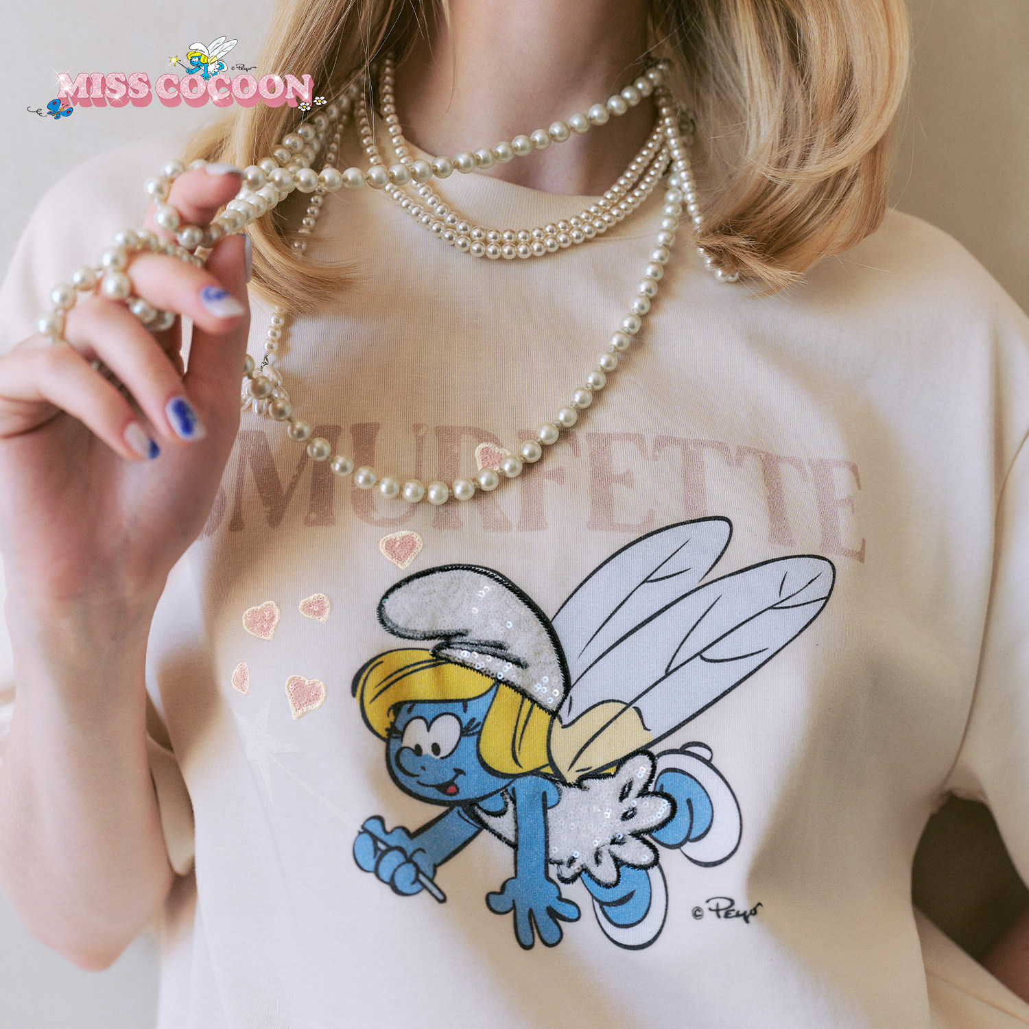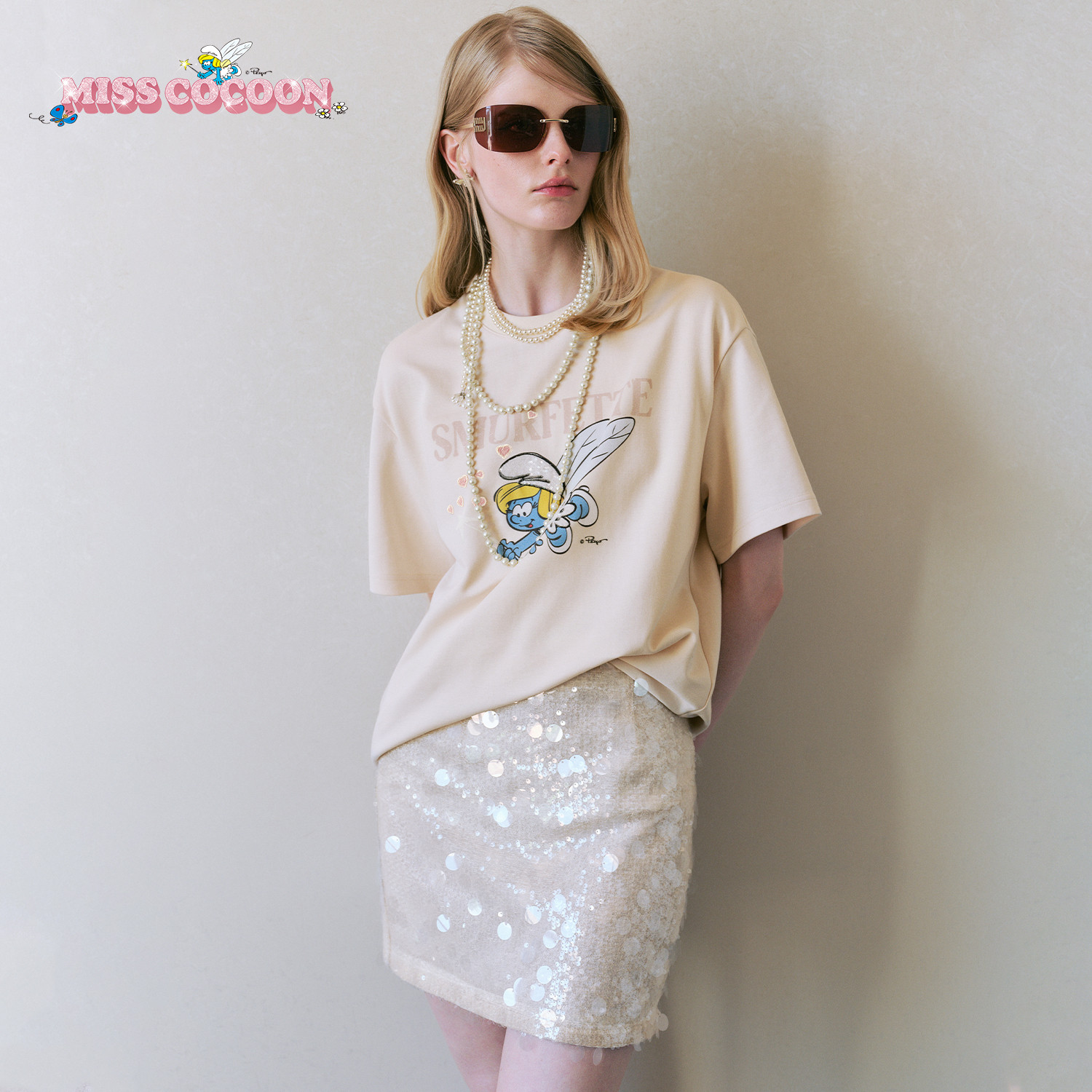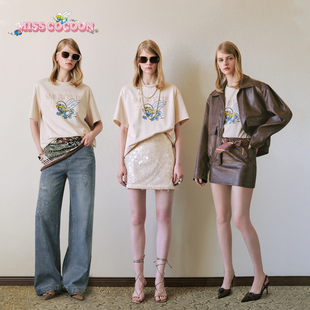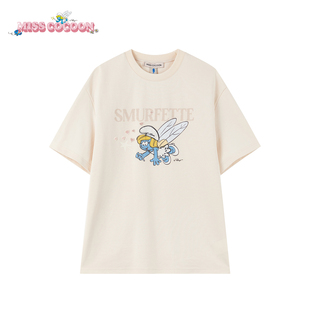 圆领米色短袖 新款 2025秋季 MISSCOCOON可可尼蓝精灵联名棉T恤女款