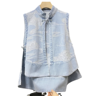 超好看新中式 国风牛仔马甲女春秋民族风网红宽松盘扣坎肩背心马夹