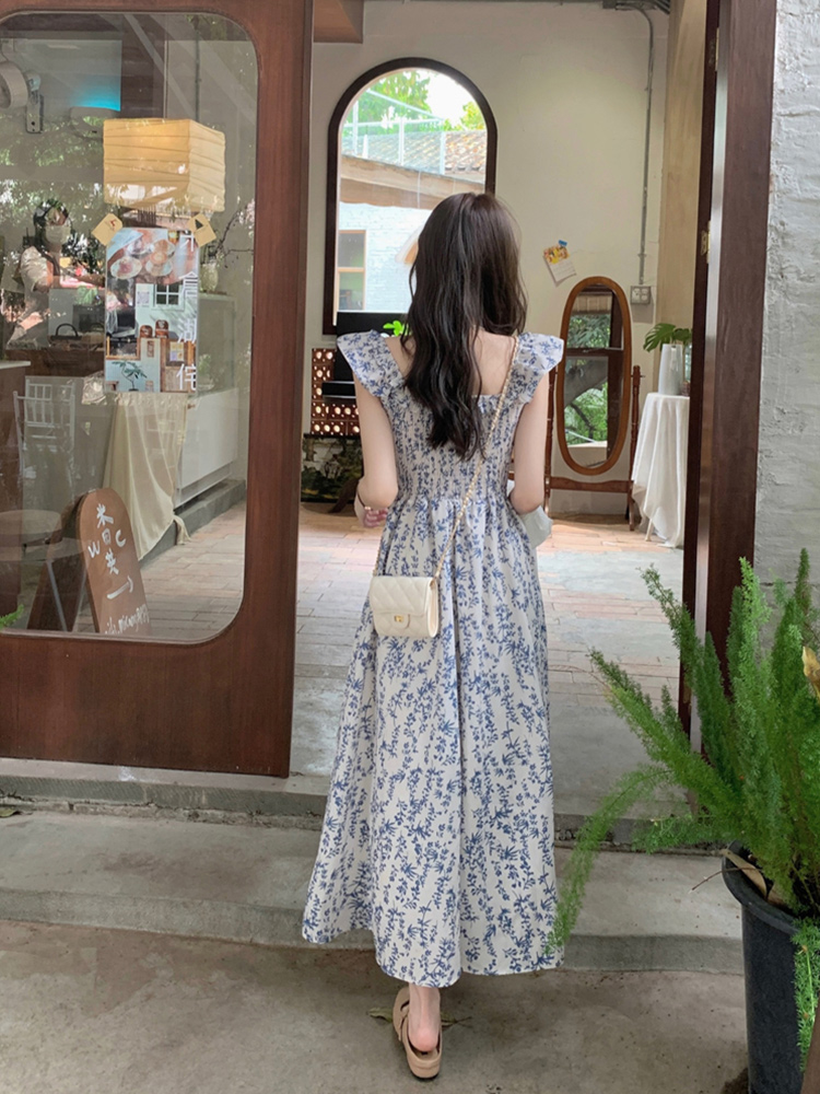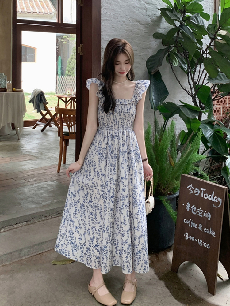 仙女碎花收腰吊带长裙沙滩裙子 新款 茶歇法式 蓝色碎花连衣裙女夏季