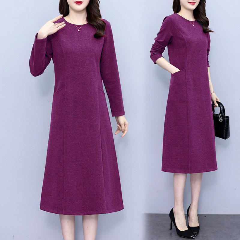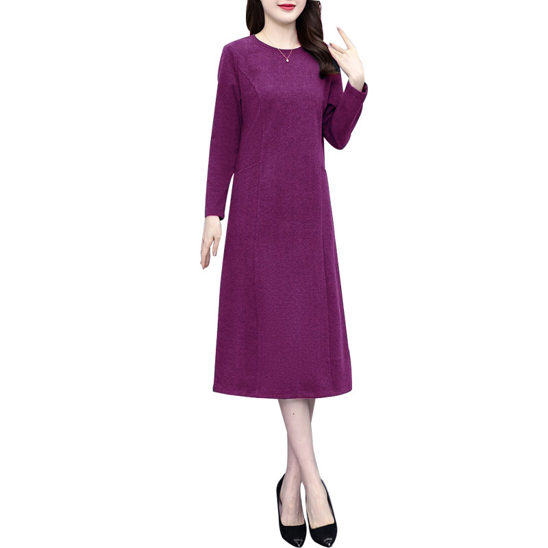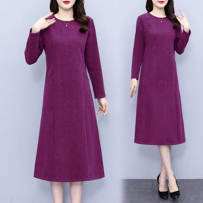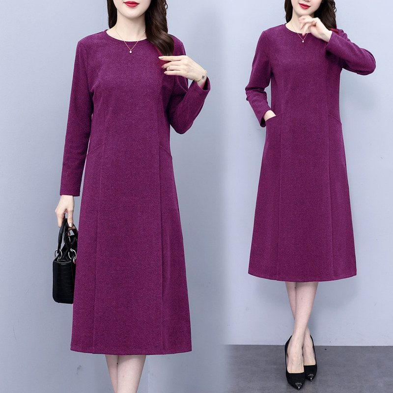 紫色连衣裙高端大气上档次小个子中老年直筒针织长袖 妈妈婚礼裙子