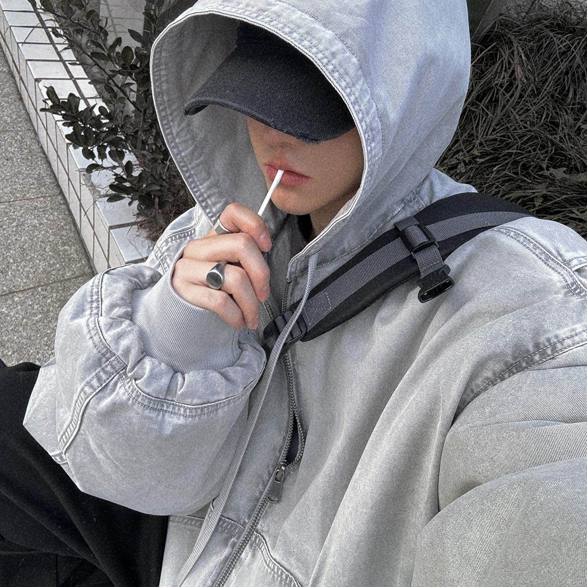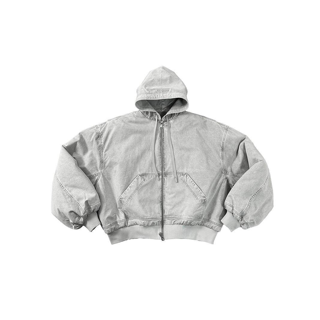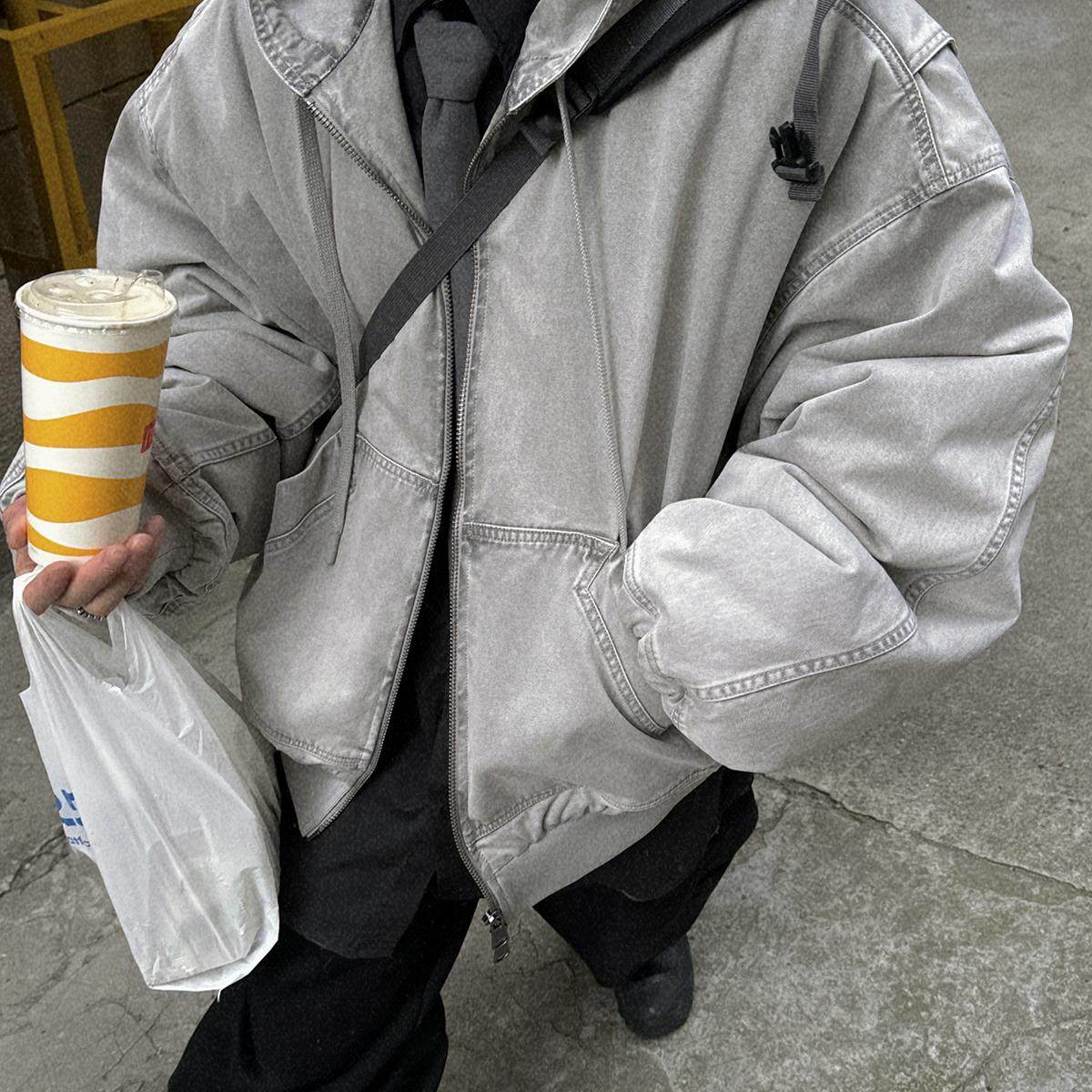 Aurocean 水洗纯棉做旧廓形加厚保暖棉衣 重炒盐灰白宽短连帽棉服
