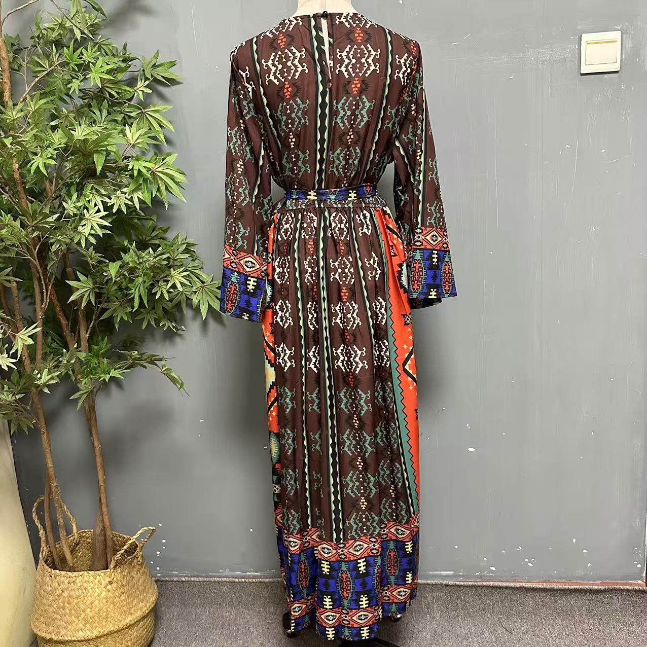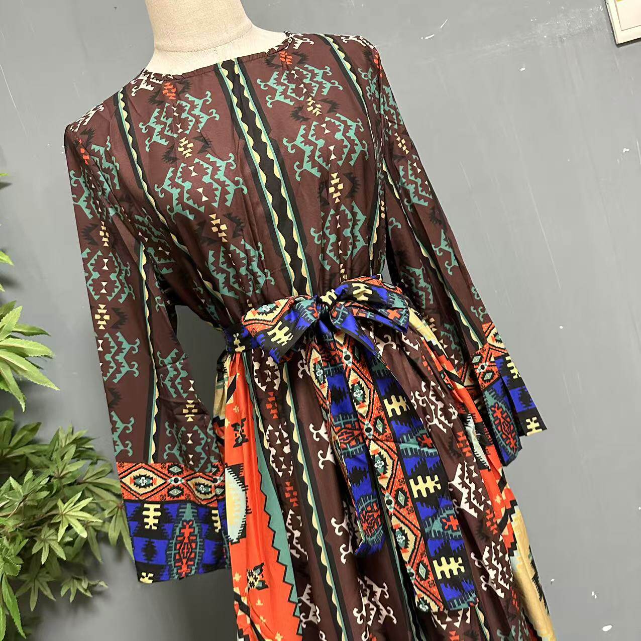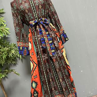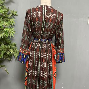 波西米亚民族风复古印花旅拍长裙茶卡盐湖松紧收腰连衣裙1022