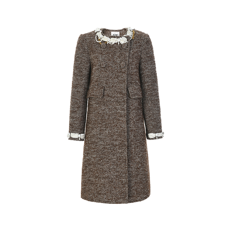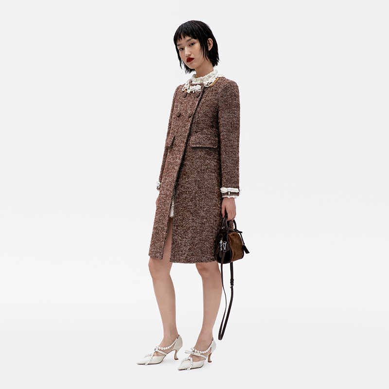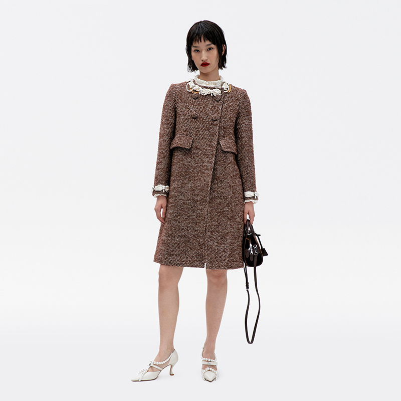 lefame拉飞姆冬季 珠链缠绕双排布包扣老钱风咖色大衣