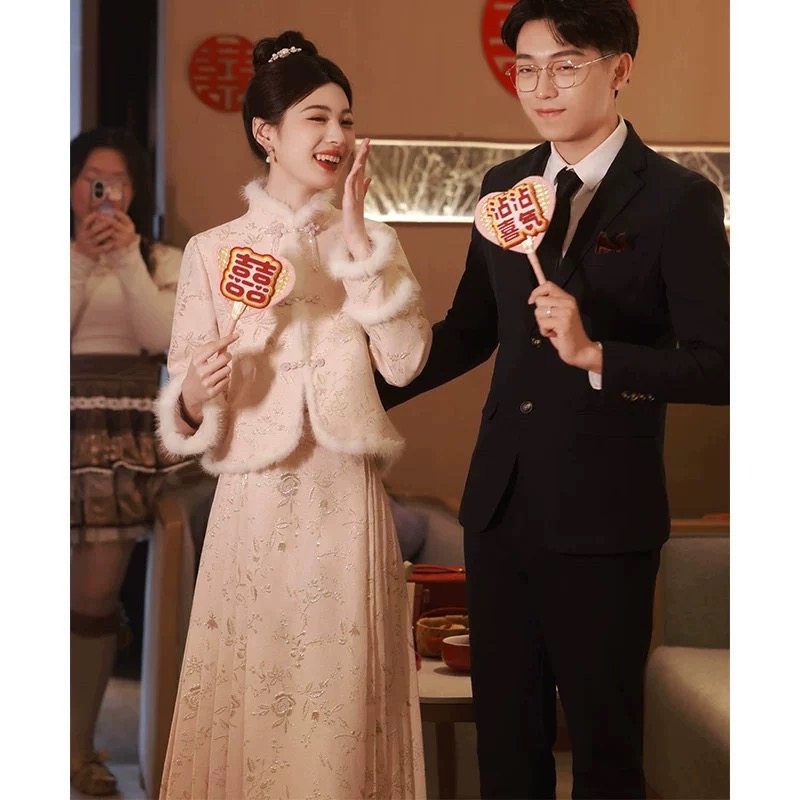 旗袍加绒毛绒领保暖 复古民国麂皮绒倒大袖 抹茶麻薯2025年冬季 新款