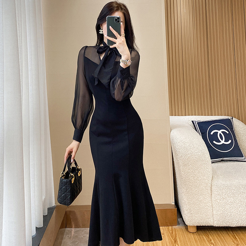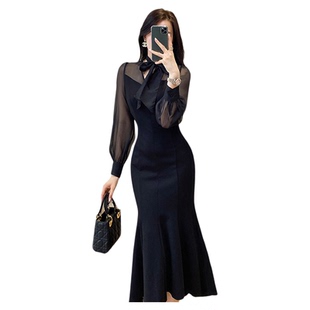 歌莉娅连衣裙女秋季 高级感气质蕾丝拼接黑色丝绒裙1C1R4H470 新款