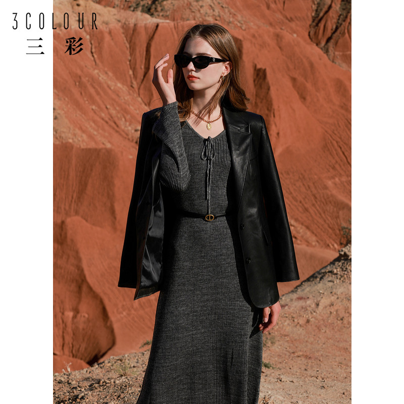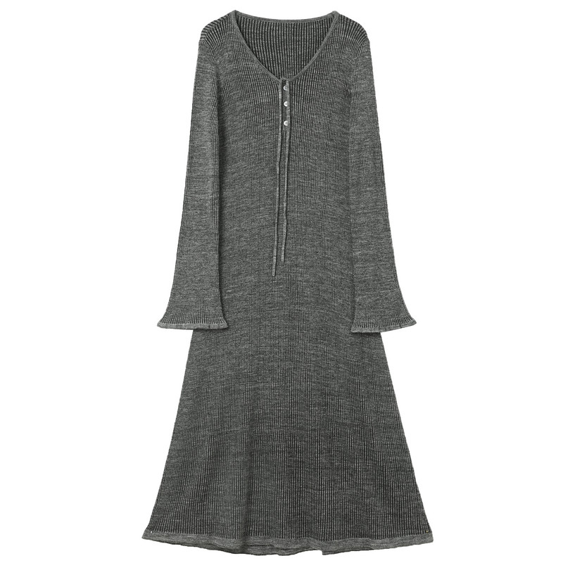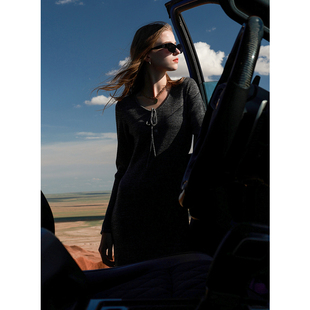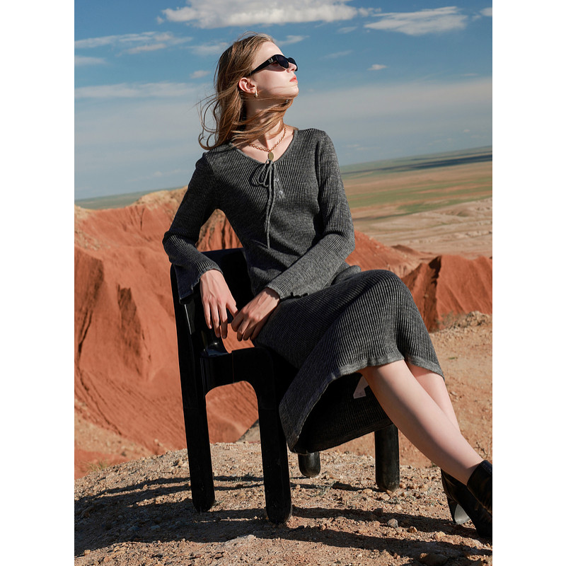 喇叭袖 针织连衣裙V领修身 长裙A字裙系带简约女M 新款 三彩2024冬季