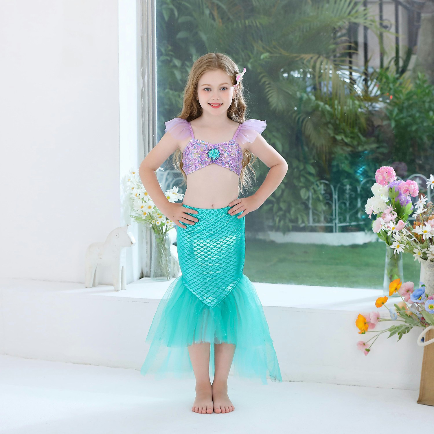 新款 女童温泉度假沙滩 爱丽儿美人鱼比基尼三件套网纱泳衣套装