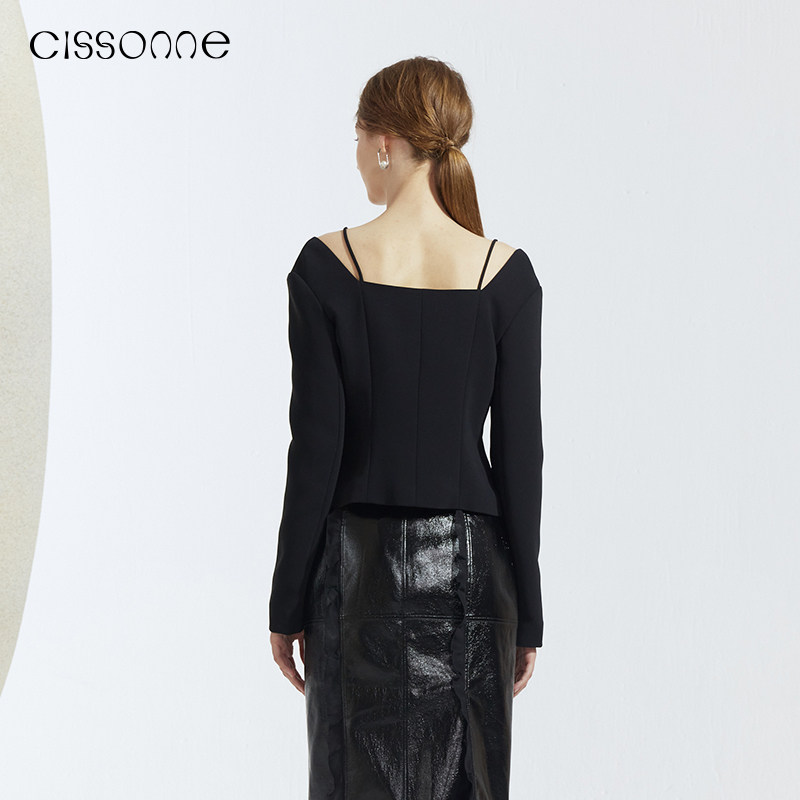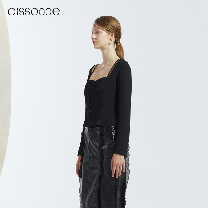 CISSONNE赛颂仿醋酸法式 复古甜美黑色蕾丝拼接结构感上衣