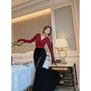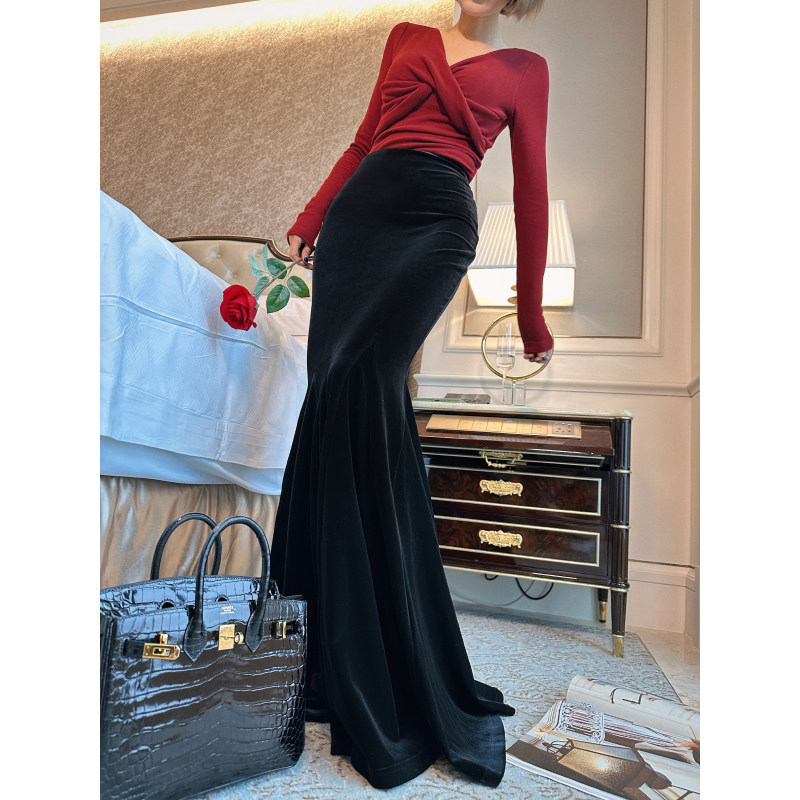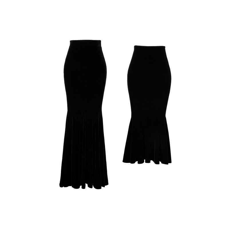 XULU原创欧洲进口黑色丝绒复古气质优雅修身 显瘦中高腰鱼尾半身裙