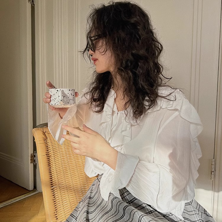 宽松衬衫 TOP家 复古宫廷风白色重工荷叶边v领长袖 法式 女 层叠浪漫
