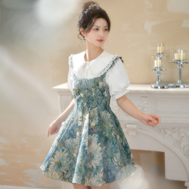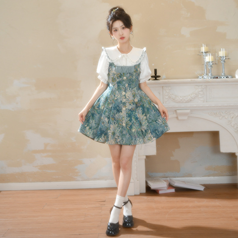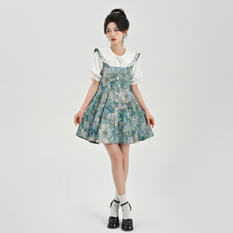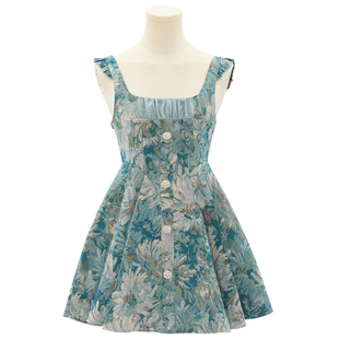 森女部落原创气质显瘦复古油画风高腰A字裙连衣裙叠穿两件套裙子